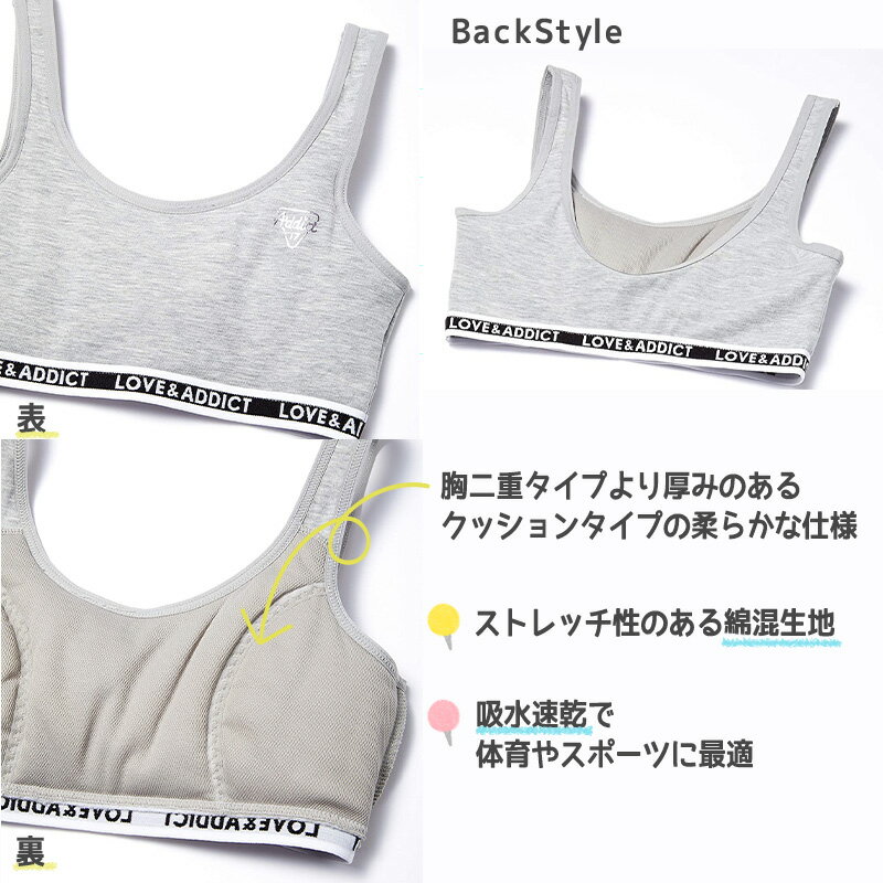ショップトップ > カテゴリトップ > キッズ・ジュニア > 女の子 > ブラジャー > かぶりタイプ◆女児ハーフトップ&ショーツ上下セットの紹介ジュニア用ハーフトップとショーツのセットインナーです。ハーフトップはソフトカップで、大きくなり始めたバストを優しくホールドカバーしてくれます。クッションのような仕様なので、モールドカップ付きほどしっかりではなく、胸二重タイプよりは厚みがあってふんわり柔らかな着け心地。身生地は綿混のストレッチ性のある吸水速乾素材で汗をかいても快適なので、体育や部活などスポーツシーンにも最適です。内側にはお名前を書けるラベルつき。シンプルなデザインで使いやすく、デイリー使いにぴったりです。【ブラ】・フロント左側に箔プリントのワンポイントマーク入り・肩ひも調節なし・ソフトカップ固定(取り外し不可)・ホックなし、かぶりタイプ・インナーラベル内側にネームタグつき【ショーツ】・ウエストゴム取替え不可・インナーラベル内側にネームタグつき【同シリーズ】「」は商品番号です女児スポーツブラ&ショーツセット「gr047」◆女児ハーフトップ&ショーツ上下セットの詳細商品名女児ハーフトップ&ショーツ上下セット対象者女の子(子供、子ども、女子)小学生、中学生サイズ150cm(身長:145-155cm/バスト:70-78cm/ヒップ:76-84cm)160cm(身長:155-165cm/バスト:76-84cm/ヒップ:82-90cm)165cm(身長:160-170cm/バスト:79-87cm/ヒップ:85-93cm)※商品によって若干の個体差がでる場合がございますカラーA:アソートB:アソート素材・加工A:アソート【ハーフトップ】本体:綿 60%/ポリエステル34%/ポリウレタン6%ゴム部分:ナイロン56%/ポリエステル44%テープ部分:ナイロン72%/ポリウレタン28%【ショーツ】本体:綿 60%/ポリエステル34%/ポリウレタン6%ウエスト部分:ナイロン56%/ポリエステル44%足口部分:ナイロン85%/ポリウレタン15%B:アソート【ハーフトップ】本体:ポリエステル62%/綿33%/ポリウレタン5%ゴム部分:ナイロン59%/ポリエステル41%テープ部分:ナイロン72%/ポリウレタン28%【ショーツ】本体:ポリエステル62%/綿 33%/ポリウレタン5%ウエスト部分:ナイロン59%/ポリエステル41%足口部分:ナイロン85%/ポリウレタン15%※カラーによって素材の比率が異なりますのでご注意ください吸水速乾/上下セット/ストレッチ天竺/ネームタグ付き生産国日本企画海外製関連キーワードしまむらファンにおすすめ k-g-bra-pul k-g-bra-fst k-g-sh-des 460269 460270女児ハーフトップ&ショーツ上下セット◆おすすめのカテゴリ ジュニア用ハーフトップとショーツのセットインナーです。ハーフトップはソフトカップで、大きくなり始めたバストを優しくホールドカバーしてくれます。クッションのような仕様なので、モールドカップ付きほどしっかりではなく、胸二重タイプよりは厚みがあってふんわり柔らかな着け心地。身生地は綿混のストレッチ性のある吸水速乾素材で汗をかいても快適なので、体育や部活などスポーツシーンにも最適です。内側にはお名前を書けるラベルつき。シンプルなデザインで使いやすく、デイリー使いにぴったりです。【ブラ】・フロント左側に箔プリントのワンポイントマーク入り・肩ひも調節なし・ソフトカップ固定(取り外し不可)・ホックなし、かぶりタイプ・インナーラベル内側にネームタグつき【ショーツ】・ウエストゴム取替え不可・インナーラベル内側にネームタグつき【同シリーズ】「」は商品番号です女児スポーツブラ&ショーツセット「gr047」 よく一緒に購入されている商品1,628円1,390円598円398円類似商品はこちら1,390円1,628円1,690円1,590円1,690円898円798円798円
