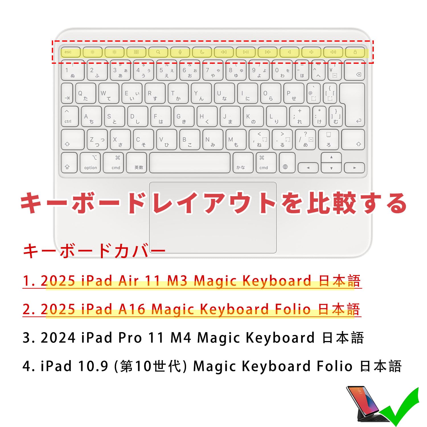 ◆【対応機種】2025年発売のiPad Air 11インチ(M3)用Magic Keyboard/ 2025年発売のiPad A16 11インチ用Magic Keyboard Folio/ 2024年発売のiPad Pro 11インチ(M4)用Magic Keyboard/ 2022年発売のiPad 10.9インチ(第10世代)用Magic Keyboard Folio。日本語JIS配列にのみ適合します。◆【超薄型】極めて透明に近い且つ薄い、僅かに0.15mm、気付かれないほど薄く、カバーを付けていても違和感のないタイピングを実現できます。夜間でも、キーボードの字がはっきりと見えます。もちろん、カバーを付けたまま閉じられます。◆【保護機能】ホコリ、汚れ、指紋、水飛沫などから完璧に保護します。カバーに付いた汚れや指紋などは中性洗剤で洗って簡単に取れます。何度も再利用可能です。◆【精確フィット】キーボートにズレなくピッタリとフィットします。ご愛用のiPad Magic Keyboardに清潔さと綺麗さを保ち、万全の守護与えます。◆【高品質TPU材質】耐久性に優れたTPU素材を採用、傷つきにくいし、指紋も付きにくい。防水・抗菌仕様なので、水気から遮断し、ばい菌も抑制でき、清潔に保てます。電気通さないTPU素材なので、帯電のご心配は要りません。