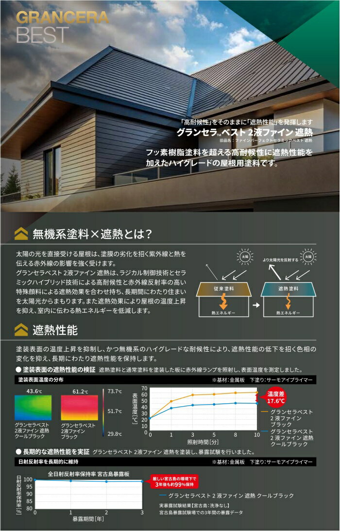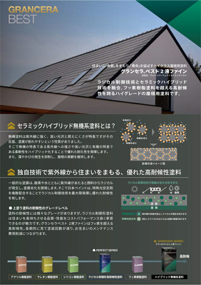 商品説明メーカー名日本ペイント株式会社 商品名グランセラベスト2液ファイン(無機系)色 各色/つや有り容量 15kgセット/3kgセット塗装回数2回塗り 塗装面積 スレート屋根 約41〜50平米/2回塗(15kgセット) 約8〜10平米/2回塗(3kgセット) 鋼板屋根 約53〜62平米/2回塗(15kgセット) 約10〜12平米/2回塗(3kgセット) 塗り重ね乾燥時間(気温23℃)3時間以上7日以内施工方法 ローラー :○ 刷 毛:○ エアレス :○※○:適 △:可 ×不適希釈(うすめ液)塗料用シンナーA 0〜10%希釈 用途 スレート、洋瓦、トタン屋根塗り替え塗料 特長 1. 優れた耐候性:促進耐候性試験において優れた耐候性を示します。 2. 幅広い対応屋根材:住宅用化粧スレート、洋瓦、セメント瓦、陶器瓦、トタン屋根等の各種屋根素材に幅広く対応します。 3. 優れた作業性:乾燥が早く、作業性に優れています。 4. 防藻/防かび性:藻/かびの発生を抑制します。 適用下地 ・住宅用化粧スレート屋根、波形スレート、洋瓦、トタン屋根