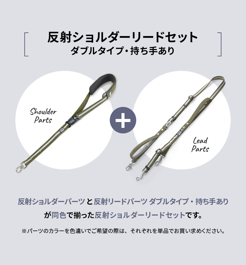 お知らせ ・使い始めは硬めですが、次第に馴染んで扱いやすくなります。 ・金具の動く部分には定期的にオイルなどを挿し、必ずお手入れを行って下さい。 ・製品の仕様などは、改善・改良のため前触れなく変更になる場合がございます。 素材 テープ:ポリプロピレン パッド表地:ナイロン パッド裏地:ポリエステル 金具類:ダイキャスト(日本製) ベルト調節具:プラスチック 反射材:ポリエステル100% 使用上の注意 ・犬専用です。犬具として以外には使用しないでください。 ・十分な強度及び耐久性をもって製作しておりますが、事故防止のため適応サイズの犬にのみご使用下さい。 ・ご使用前後には必ず点検を行い、傷・磨耗・劣化などによる事故に十分ご注意下さい。 ・経年劣化により不具合を発見された際には、補修・修理を承りますのでご相談下さい。 返品・交換について 詳しい内容は、お手数ですが【返品・交換についての詳細】で必ずご確認いただきますようお願い致します。【ショルダーリードセット 機能比較表】 タイプ 反 射 パッド付き持ち手 サブハンドル シングル ○ ○ ○※注意 ダブル ○ ○ ○※注意 シングル ○ × × ダブル ○ × × ※Sサイズはリード全体の重量が増すことを考慮し、サブハンドルは付属しておりません。