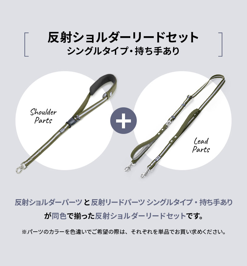 お知らせ ・使い始めは硬めですが、次第に馴染んで扱いやすくなります。 ・金具の動く部分には定期的にオイルなどを挿し、必ずお手入れを行って下さい。 ・製品の仕様などは、改善・改良のため前触れなく変更になる場合がございます。 素材 テープ:ポリプロピレン パッド表地:ナイロン パッド裏地:ポリエステル 金具類:ダイキャスト(日本製) ベルト調節具:プラスチック 反射材:ポリエステル100% 使用上の注意 ・犬専用です。犬具として以外には使用しないでください。 ・十分な強度及び耐久性をもって製作しておりますが、事故防止のため適応サイズの犬にのみご使用下さい。 ・ご使用前後には必ず点検を行い、傷・磨耗・劣化などによる事故に十分ご注意下さい。 ・経年劣化により不具合を発見された際には、補修・修理を承りますのでご相談下さい。 返品・交換について 詳しい内容は、お手数ですが【返品・交換についての詳細】で必ずご確認いただきますようお願い致します。【ショルダーリードセット 機能比較表】 タイプ 反 射 パッド付き持ち手 サブハンドル シングル ○ ○ ○※注意 ダブル ○ ○ ○※注意 シングル ○ × × ダブル ○ × × ※Sサイズはリード全体の重量が増すことを考慮し、サブハンドルは付属しておりません。