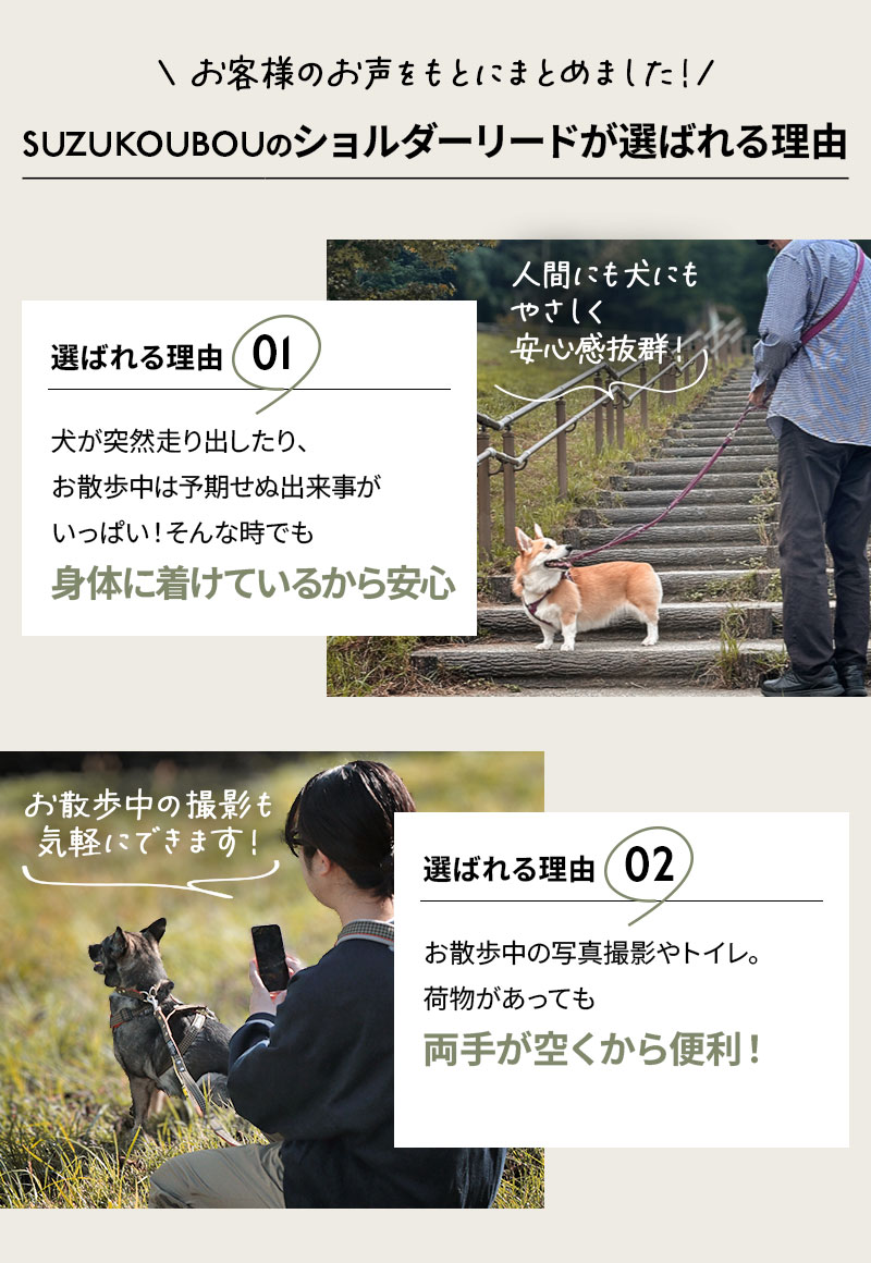 犬 リード ショルダーリード ハンズフリー 肩掛け 肩パッド付 高強度 ツヌーガリップ リップストップ 軽量 丈夫 日本製 プロ仕様 迷子防止 逸走防止 2WAY 首輪 ハーネス対応 サブハンドル付 ねじれない 長さ調整 多頭対応 小型犬 中型犬 大型犬 すず工房 SUZUKOUBOU “日常に、プロスペックを。” 高強度繊維ツヌーガ®を採用したリップストップ素材のショルダーリード。 肩掛けできるハンズフリー仕様で、うっかり手が離れても安心。 2WAY設計で首輪・ハーネスの両方に対応し、迷子防止・逸走防止にも最適。 サブハンドル付きで制御しやすく、ねじれ防止回転カン&長さ調整機能で快適。 軽量で丈夫な日本製プロ仕様リードです。 お知らせ ・使い始めは硬めですが、次第に馴染んで扱いやすくなります。 ・金具の動く部分には定期的にオイルなどを挿し、必ずお手入れを行って下さい。 ・製品の仕様などは、改善・改良のため前触れなく変更になる場合がございます。 素材 ベルト表地:ナイロン93%・ポリエチレン7% ベルト裏地:ポリプロピレン パッド表地:ナイロン93%・ポリエチレン7% パッド裏地:ポリエステル 金具類:ダイキャスト(日本製) バックル:プラスチック(米duraflex社製) 使用上の注意 ・犬専用です。犬具として以外には使用しないでください。 ・十分な強度及び耐久性をもって製作しておりますが、事故防止のため適応サイズの犬にのみご使用下さい。 ・ご使用前後には必ず点検を行い、傷・磨耗・劣化などによる事故に十分ご注意下さい。 ・経年劣化により不具合を発見された際には、補修・修理を承りますのでご相談下さい。 返品・交換について 詳しい内容は、お手数ですが【返品・交換についての詳細】で必ずご確認いただきますようお願い致します。