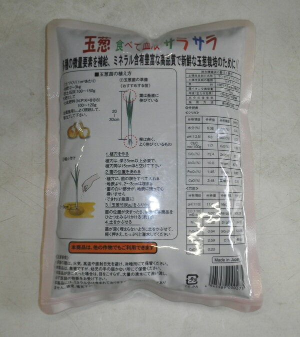 天然活力資材「玉葱竹炭」300g/300g×2袋(サングリーンオリエント)【送料込み】 たまねぎちくたん タマネギチクタン 肥料 発根・活着促進 土壌浄化 高温障害 病害忌避 生長促進 玉肥大 品質向上 肥効促進 玉葱の発根と活着を促進!苗床の必需品!立ち枯れ病やべと病などの発生を抑えます! ●土壌の乾燥を防ぎ、水持ちを良くします。●竹炭の持つ有用ミネラル分を供給し、腐りにくい玉葱を作ります。●土壌のpH を適度に保ち、発根を促進します。<使用方法>玉葱苗を植穴に入れた後、根元にひとつまみ(約1g)ふりかけ、覆土し、たっぷりの水をかけて下さい。 5