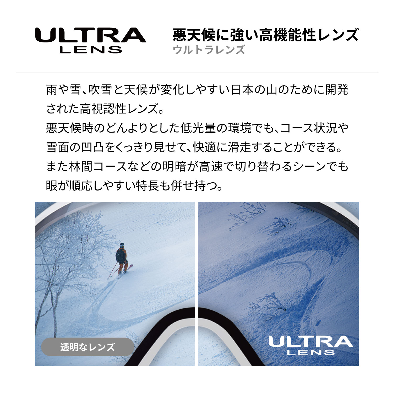 レンズのくもりを防ぐ換気機能「A-BLOW SYSTEM」搭載 眼鏡と併用可能な平面レンズモデル LENS TECH ■ ULTRAレンズ 雨や雪、吹雪と天候が変化しやすい日本の山のために開発された高視認性レンズ。悪天候時のどんよりとした低光量の環境でも、コース状況や雪面の凹凸をくっきり見せて、快適に滑走することができる。また林間コースなどの明暗が高速で切り替わるシーンでも眼が順応しやすい特長を併せ持つ。 ■ 調光レンズ 紫外線に反応して明るさが自動的に変化する機能を持つレンズ。紫外線量が多いほどレンズカラーが濃くなり、少ないと薄くなるため、晴天から曇天、降雪・降雨まで様々な天候に対応。SWANSの調光レンズは、一般的なものよりも「色の変化が早く」「少量の紫外線にも反応する」のが特長。 ■ PREMIUM ANTI-FOG 当社従来品に比べ2倍の吸水力を持つくもり止め技術。レンズ内側に施されたコーティングが、ゴーグル内部にたまる湿気をスポンジのように吸収することでくもりを抑制する。くもり止め効果は吸収した湿気が乾くたびに再生するため、繰り返し使用しても高いくもり止め効果を発揮する。 ■ クラリテックスコート(撥水・防汚) 雨や雪などの悪天候でもレンズへの水滴や雪の付着を防ぎ、汚れの付着も抑え、クリアな視界を確保します。 ■ UVカットレンズ SWANSのスノーゴーグルは全てのモデルで紫外線99.9%以上カット。製造段階で紫外線吸収剤をレンズに練り込んでいるため、キズや経年劣化によるレンズの性能変化が発生しない。そのため雪山での強い紫外線からしっかり眼を保護し、長時間にわたって安心して使用することができる。 FRAME TECH ■ A-BLOW SYSTEM 両サイドのトリガーパーツを起こすとレンズがポップアップ。ゴーグル内部の湿気を排出して、レンズのくもりを抑える。グローブをしたままでも簡単に操作が可能。 ■ ジャパンフィットフォーム 日本人の顔にフィットする、やわらかなフィット感の顔当たりフォーム。 ■ 眼鏡対応 眼鏡との併用可能なフレーム設計。 ※眼鏡の大きさやデザインによっては、ご使用いただけない場合があります。 ■ クラリテックスメッシュ フレーム上部のベンチレーション部分には、雪が積もりにくく、内部に水分が侵入しづらい「撥水性」に特化した特殊メッシュ素材を採用。 フレームカラー WBL・MBKF・CRW・GLR・ROP 全5色 レンズカラー ULTRA調光ミラー(ライトパープル/アイスミラー)4265 レンズカテゴリー(可視光線透過率) S2 - S3 紫外線透過率 0.1%以下(UVカット99.9%以上) レンズ形状 成形平面レンズ ダブルレンズ レンズ機能 フォトクロミックレンズ(調光レンズ) ULTRA LENS(高視認性レンズ) PREMIUM ANTI-FOG (高性能くもり止め) クラリテックスコート(撥水加工) ミラーコート フレーム機能 A-BLOW SYSTEM 眼鏡併用可能 ヘルメット対応 超撥水メッシュ ノンスリップストラップ ラウンドバックル(※別売ベルトクリップ:BH-12対応) サイズ W195×H105×D80 (mm) 付属品 ゴーグル用巾着袋 生産国 日本