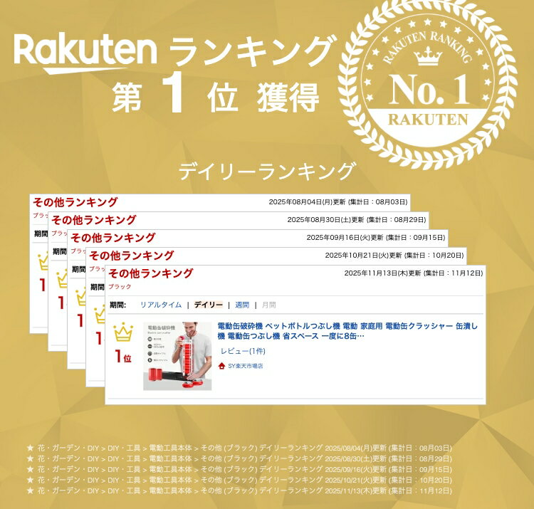 商品情報【寸法】本体:長さ435mm×幅90mm×高さ90mm【重量】4kg【最大容量】缶8個【材質】金属製【出力】58W【電圧】100-110V/50-60Hz【付属品】日本語取扱説明書1個電動缶破砕機 ペットボトルつぶし機 電動 家庭用 電動缶クラッシャー 缶潰し機 電動缶つぶし機 省スペース 一度に8缶充填可能 (ブラック) アルミ缶潰し 空き缶潰し器 ペットボトル 圧縮 金属缶クラッシャー 省力 操作簡単 注意事項: 本製品はアルミ製の空き缶と、一部のサイズに対応したペットボトルのみ圧縮可能です。ガラス瓶やスチール缶には使用できません。 連続15分間使用した後は、モーター保護のため使用を停止してください。 5