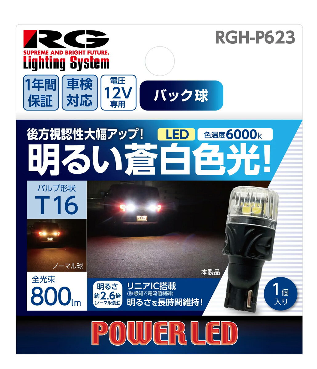 ■品番RGH-P623■メーカーRACING GEAR/レーシングギア■商品名LED SUPPORT BULB SERIES バック専用 LEDバルブ■位置バック■自動車メーカーDAIHATSU/ダイハツ■車種ムーヴキャンバス■型式LA800/810S■年式H28.9〜R4.6■車種備考■純正形状T16■必要セット数2個■備考■バルブ入数1個■形状T16■色味6000K■明るさ800lm■定格12V4W■商品説明片側800ルーメンの大光量後方視認性大幅アップ!明るい蒼白色光!ノーマル球最大約2.6倍。リニアIC搭載で熱に明るさダウンを抑制し長時間維持します。*車検対応*バック専用*1年間保証*色温度6000K*明るさ800ルーメン*360°照射*12V専用品*極性フリー*HV/EV対応◎T16形状 P623◎ノーマルバルブT16は約310ルーメン。T16形状のP623は800ルーメンと約2.6倍明るくなります。バックランプ専用バルブ超高輝度LED12ヶ使用(16素子)1年間保証付き!明るい蒼白色6000K!極性フリーで、ノーマルバルブと同サイズの為、形状が合えば車両問わず装着可能。※車種別適用表参照ください。輸入車は適用していません。※商品はバルブ1個入りです。※明るさ1灯の値です。※消費電力は1灯の表記です。※12V車専用モデルです。商用車は適用不可です。(自家用車に限る)■JANコード4996327108085■納期メーカー取り寄せ品の為、通常即日〜4営業日以内に発送致します。■ご注文時注意事項※こちらの商品はメーカー直送品の為、代金引換と後払い決済がご利用頂けません。代金引換や後払い決済でご注文頂いた場合は、お客様にご確認の上、他決済方法への変更依頼、又はご注文のキャンセル処理を行わせて頂きます。 ※ ご注文前に必ずご確認下さい お急ぎの場合はご購入前に納期確認をお願い致します。 納期について *メーカー在庫が欠品の場合、改めて納期をご連絡致します。 *メーカーにて予告無く廃番、仕様変更になっている場合があります。 返品・キャンセルに関して *お客様都合による返品・キャンセル・商品の変更は一切お受けしておりません。 *在庫・納期・適合未確認でご購入された商品のキャンセルは一切お受けしておりません。 *代引きで納期が半年以上の商品をご注文の場合はキャンセルさせていただきます。別の決済方法でご注文下さい。