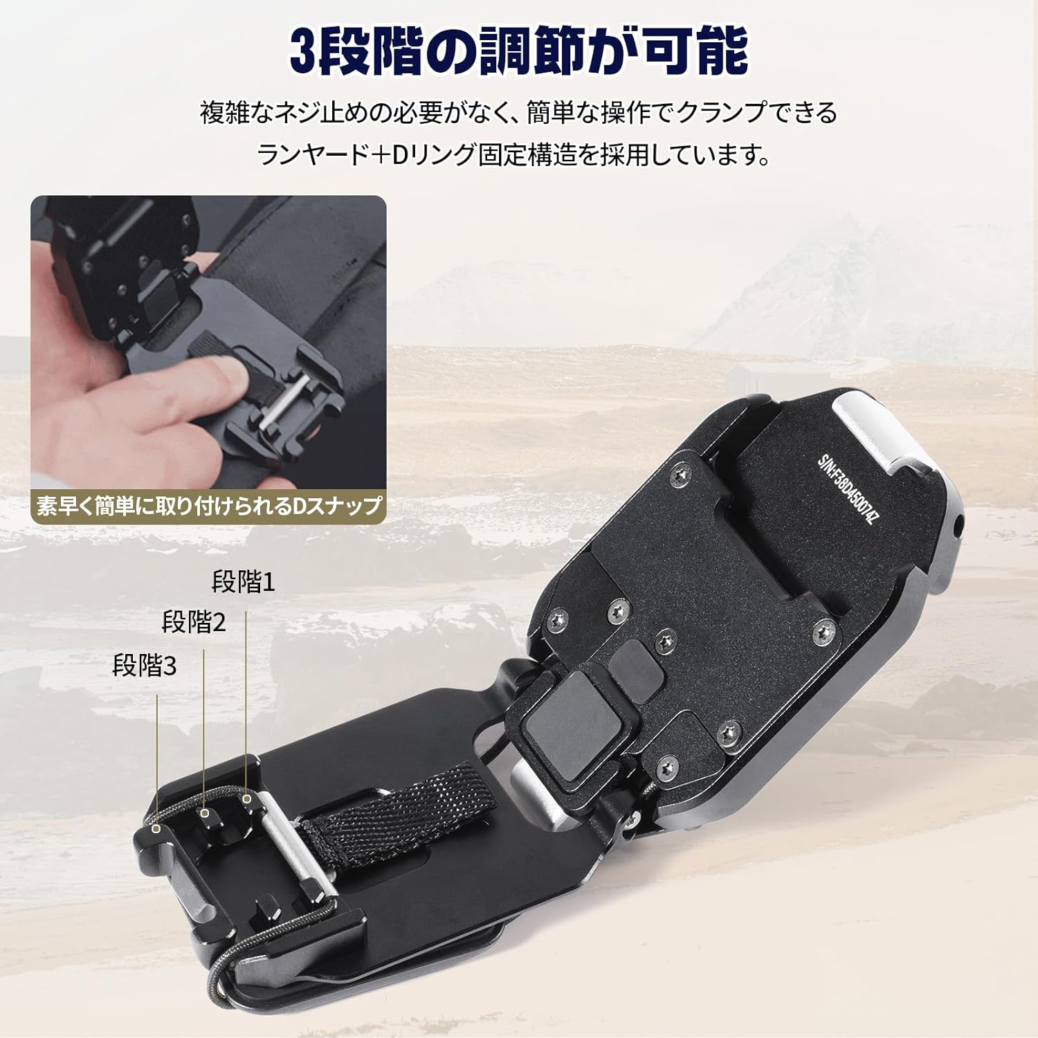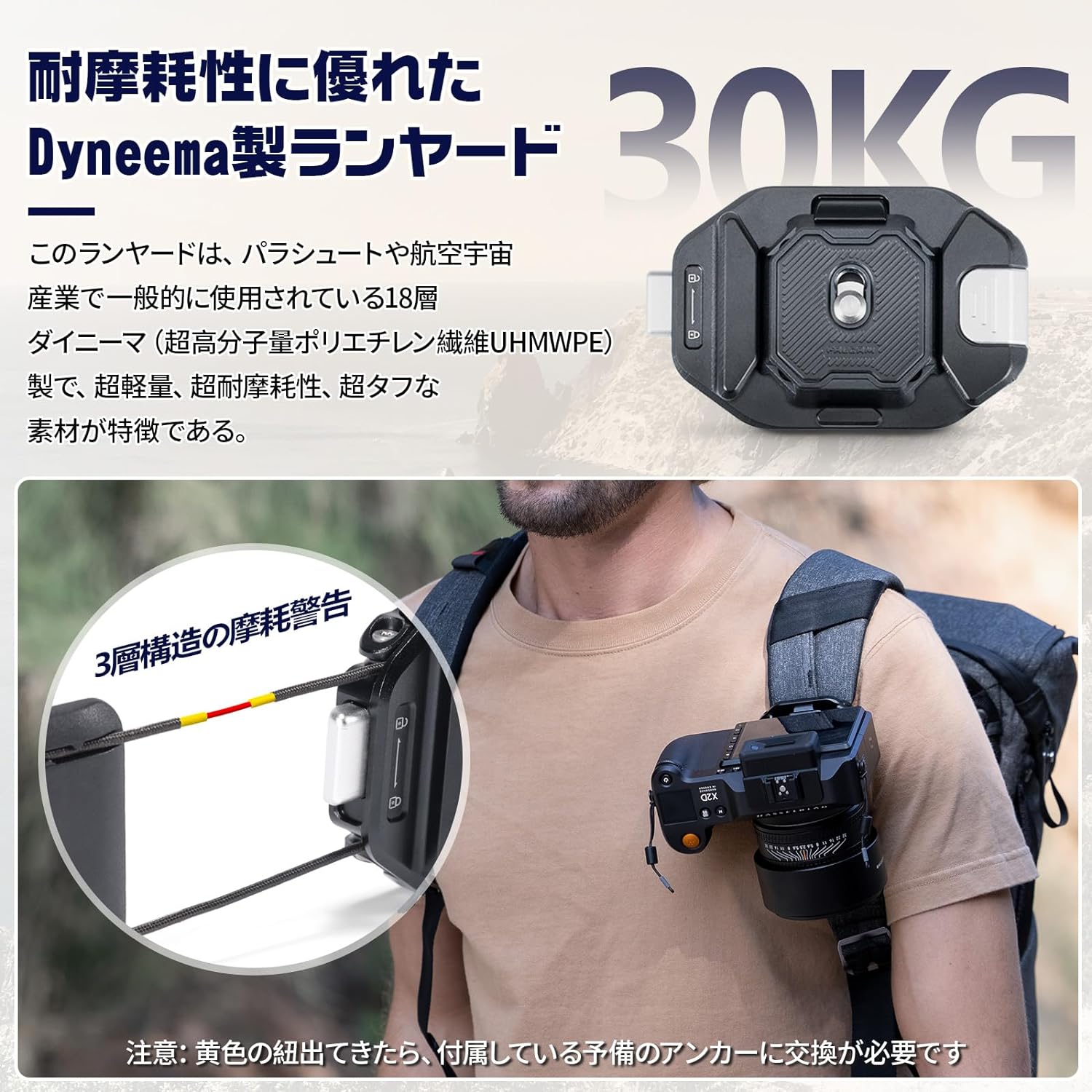 【商品内容】 Falcam F38 バックパックストラップクリップ ・トップマウント X1 ・ベースマウント X1 【商品仕様】 カメラをバックパックのストラップやズボンのベルト等に取り付けるためのクイックリリースシステムです。カメラをバックパックに安全に取り付けることができ、クイックリリース機能により簡単に取り外すことが可能です。旧モデルと比較して、カメラホルスターV2はより高い耐荷重を持ち、取り付けの自由度が若干高く、さらに多機能なアダプターを提供しています。プレートをカメラにつけておくことで、ワンタッチで着脱、プレートのスライドして差し込むと自動でロック。複数のカメラは同一の機器に素早く切り替えられます。またはカメラを複数の機器に素早く切り替えられるので、手間が省けてとても便利です。 複雑なネジ止めの必要がなくクランプ面は、様々なストラップのカーブにも突出することなく適応する、柔軟な構造のランヤード・クロージャーを初めて採用しました。丸い熱可塑性樹脂のバッキングプレートはストラップにぴったりとフィットし、ランヤード本来の感触を保ちます。 圧迫感のない快適な装着感を実現。 アルカスイス互換の雲台側パーツ(クランプ)にセットすることができます。三脚を使った撮影が多い方は、このアルカスイス互換タイプのプレートを使ったカメラホルスターを選ぶと便利です。クイックプレートは四つの方向に自由に装着可能でカメラの位置を特定する必要がなく、取り付け方向を自由に調整できます。プレートの角の部分には紐を通す穴があり、ストラップとの併用もできます。 ランヤードは、Maglinkの耐摩耗性に優れた18本織りのダイニーマロープ(Dyneema)素材を使用し、最大30kgまでの荷重に耐えることができ、さまざまな機種のニーズに対応しています。一方、従来のノブを引き出すロック方式に比べ、新しい構造はスライドさせるだけで2重ロックでき、操作がより簡単になりました。ロック機能はボタンの引きが悪いという問題を軽減。ボードをスライドさせて差し込むと自動的にロックされ、サイドボタンをスライドさせると簡単に2回目のロックとロック解除ができます。 バックプレートは3段階に調節可能で、2mm~20mmの厚さのストラップに対応し、ほとんどのストラップのサイズに適しており、異なる厚さのストラップのクランプに対応できます。 2種類の太さのコードが付属しており、Sサイズのランヤードは75mm以下の帯域幅に対応し、Mサイズのランヤードは80mm以下の帯域幅のバックパックストラップに対応します。 【補足】 ※SYH SHOPはUlanzi社の正規代理店です。 ※商品保証は商品お受取りから1週間以内の初期不良の場合のみ交換にて対応させていただきます。それ以降のご報告の不良に関しましては対応致しかねますので予めご了承くださいませ。 ※仕様は予告なく変更する場合がございます。 ※本商品の使用については、全てお客様各位の責任において利用くださいませ。本商品を原因とする機器の破損、データの損失等、弊社では一切の責任を負いませんので、予めご了承くださいませ。
