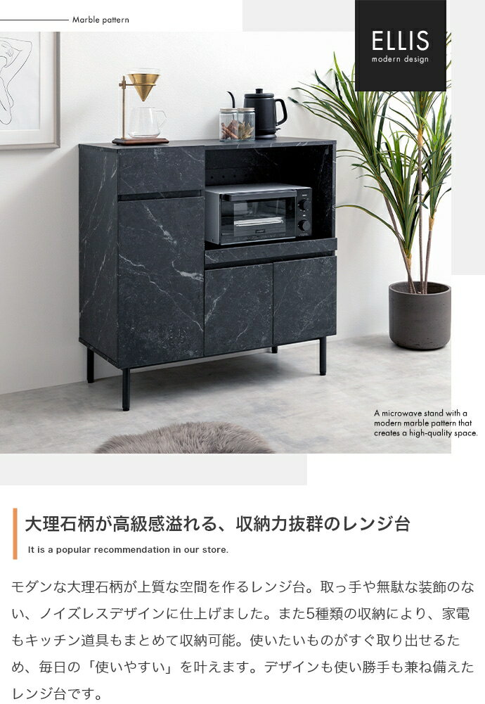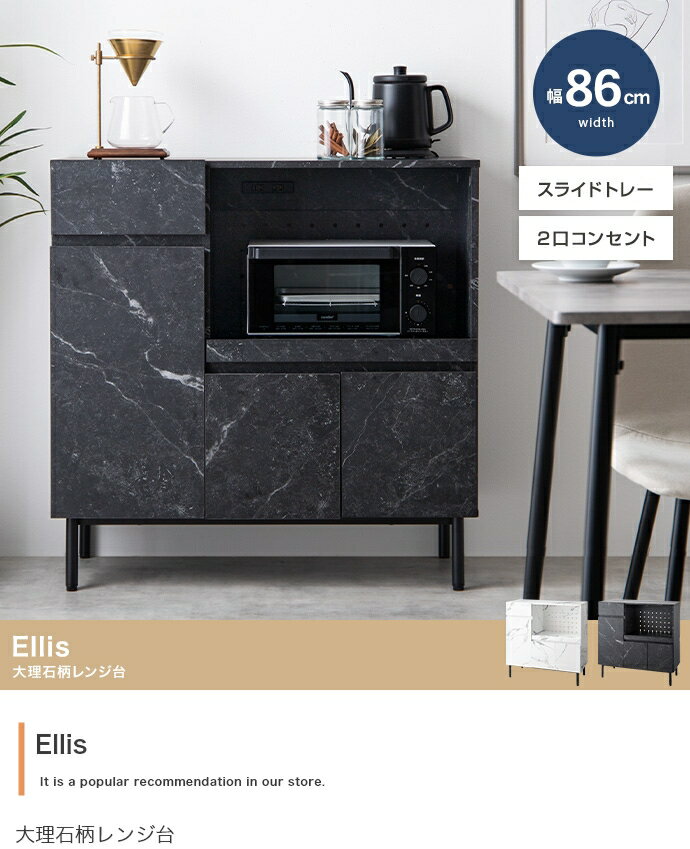 【幅86cm】Ellis 大理石柄レンジ台 大理石柄の美しさが際立つ『Ellis(エリス)』シリーズのレンジ台。直線的なフラットデザインで、置くだけで落ち着いた大人な空間を演出します。また5種類の収納を備えており、家電や細かい調理道具をまとめて収納可能。使いたいものがすぐ取り出せるため、毎日の「使いやすい」を叶えます。デザインも使い勝手も抜群の、洗練されたレンジ台です。 サイズ 幅86cm×奥行38.5cm×高さ87cm 素材 パーティクルボード(メラミン貼り)、MDF(メラミン貼り) スチール(粉体塗装) 備考 【梱包サイズ】95cm×43.5cm×20cm 【梱包重量】約32.2kg 【商品重量】約31kg 【耐荷重】天板:約30kg、引き出し底板:約5kg、可動棚:約8kg 扉収納底板:約15kg、スライドトレー:約15kg、両開き収納:約15kg ※組み立て時間:2人以上で約120分 ※プラスドライバーをご用意ください。 ■送料送料無料北海道・沖縄・離島の配送は別途配送料が必要になる場合がございます。 バリエーション ◇キャビネット ◇レンジ台 ▲上記をクリックして、各ページをご覧いただけます