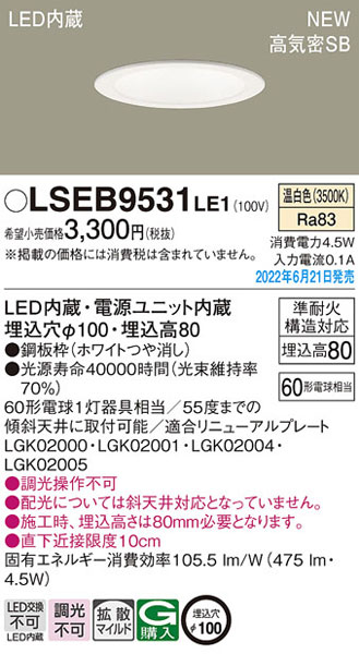 パナソニック「LSEB9531LE1」LEDダウンライト/温白色/埋込穴100パイ/調光不可/LED交換不可/要工事/LED照明