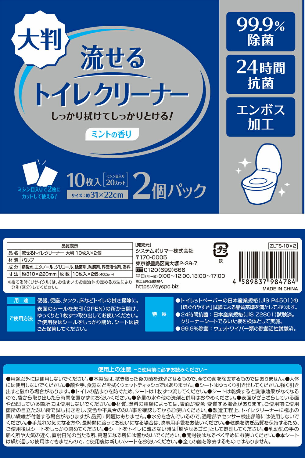 【ZLTS-10×2】流せるトイレクリーナー大判 【(10枚入2個パック)×36個入】(掃除用 トイレシート 除菌 抗菌 エンボス加工 ミントの香り 使い捨て 使いすて ながせる 便座クリーナー)【送料無料(一部地域を除く)】[syspo]