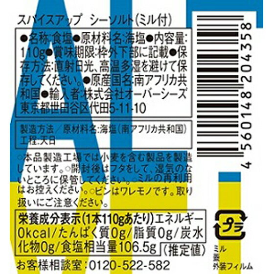 スパイスアップ シーソルト 瓶ミル付 110g 南アフリカ共和国 食塩 調味料 コンビニ受取対応商品 お酒 お歳暮 プレゼントトデー プレゼント