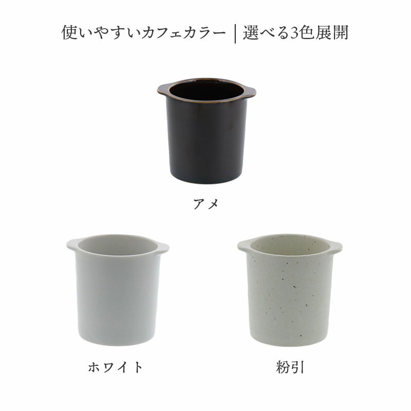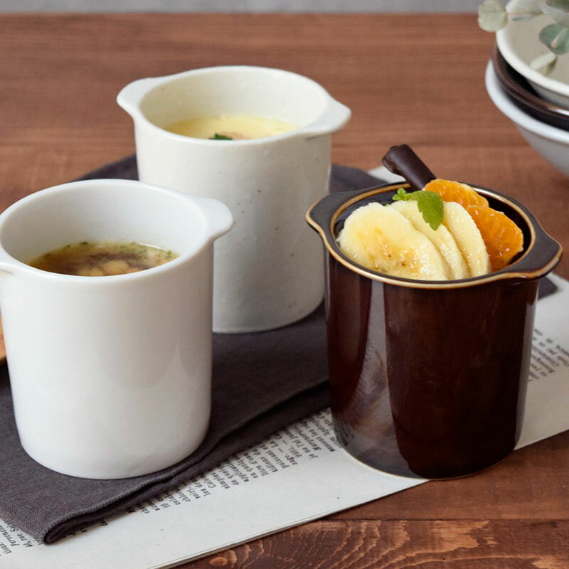 商品説明 こちらの商品は、『蓋なし』です。 寸胴型のお鍋が小さくなったような形の耳付きココット。 こちらはメーカーに依頼して1から作成したEASTtableオリジナル商品です。 和洋問わず使えるデザインで、思わず自慢したくなるような他にはあまりない茶碗蒸し碗。 茶碗蒸し以外にも、スープカップやデザートカップなど、たくさんの使い方を楽しんでいただけます。 電子レンジ、食洗機、オーブン使用OK。機能性も抜群で、気軽にどんどん使えるようになっています。 EASTtableの想いがつまった蓋付きココット。 小鉢、スープ、デザートなど、ぜひ色々使ってみてください。 商品詳細 サイズ/口径7.2×8.7×高さ7.8cm 重さ/約150g(商品により誤差があります) 容量/約 230cc(満水) 質感/つややか 素材/磁器 生産地/日本(美濃焼) 電子レンジ、食器洗い機使用可 オーブン可 直火・IH不可 ※サイズは全て外寸になります。 ご注意※ご注文前に商品の特性・当店の検品基準をご確認ください。 ※こちらの商品は、『蓋なし』です。 ※アウトレット込みの商品です。 ※アメ色は、釉薬による色の濃淡や、釉薬垂れによる色ムラが出やすいのが特徴です。 ※多少のピンホール(針で空けたような小さな穴)やボロ(ごく小さな突起物)が見られる場合がございます。 ※製造工程上、縁に凹凸が見られる場合がございます。 ※お客様のお使いのモニター設定、お部屋の照明等により実際の商品と色味が異なって見える場合がございます。 ※画像に含まれる小物は使用イメージのために使用しています。 ※不明な点がございましたら、お気軽にお問い合わせ下さい。 EAST table(イーストテーブル)の和食器 和食器というと、瀬戸物、焼き物、陶器という総称で一般的に呼ばれています。 EAST table(イーストテーブル)(旧:テーブルウェア イースト)で販売中の和食器は、陶磁器の生産シェア日本一を誇る、岐阜県土岐市をはじめとする「美濃焼」を中心に取り扱っています。 (各商品の産地は各商品詳細をご覧ください。) 全国各地に陶器の産地がありますが、美濃焼きはバリエーション豊かな作風が特徴で、伝統的な織部や志野を始め、今人気の波佐見焼きや北欧食器に負けないモダンなものまで製作しており、それらを卸問屋を通さず産地直送で格安で販売しています。 そして和食器は豊富なサイズ、形、模様が魅力。 そして、和食だけでなく洋食中華とお料理を問わず使える懐の深い器。 当店では、大皿・中皿・小皿・取り皿・カレー皿・グラタン皿、大鉢、中鉢、小鉢、お茶碗、湯呑、茶碗蒸し、箸、箸置き、急須、丼、蕎麦猪口など豊富なアイテムを取り揃えております。 茶碗蒸しは、古くから愛される日本料理のひとつ。 ちゃわんに具材を入れ、溶き卵に薄味の出し汁を合わせたものを入れ、蒸し器等で蒸したものです。 具材も、ご当地ならではのものが多くギンナンの代わりに栗の甘露煮を入れて茶碗蒸しを楽しむ地域もあるそう。 便利な蓋つきで、おいしさをそのまま閉じ込め食卓に運ぶことのできる茶碗蒸しの器ですが、現代ならではの洋風でおしゃれなデザインも主流になりつつあります。 シンプルな白や、モダンな黒、昔ながらの雰囲気を感じることのできる和柄など種類も様々。 電子レンジ、食洗機、オーブンOKと扱いやすく気軽に蒸し料理が楽しむことができ、シンプルなデザインの蒸し碗となるとスープカップとしても使える手軽さが嬉しいポイント。 スイーツ作りの食器としても活躍してくれるので、一年中出番がありそうですね。 ぜひ日常使いのうつわとして、カジュアルに蒸し碗料理を楽しんでみてはいかがでしょう。ジャポネココット蓋付き ジャポネココット蓋のみ