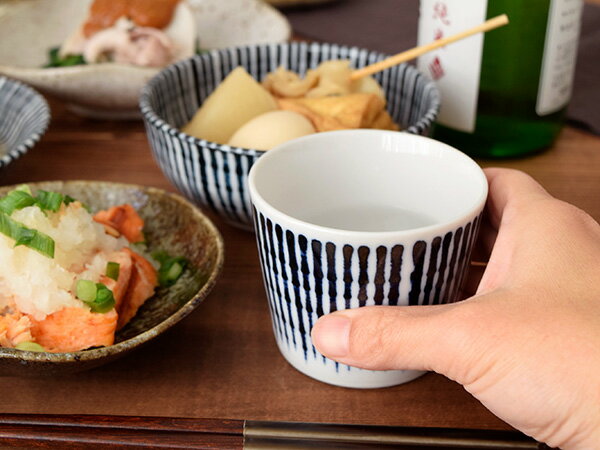 商品説明 まるで手書きのような雰囲気の十草模様がおしゃれな、和食器シリーズ。 深みあるネイビーの十草がシックな雰囲気を演出します。 こちらはそば猪口です。蕎麦猪口としてそばのつけ汁はもちろん、つけ麺のタレなど、そば以外にも使えます。 使いやすい定番の形状ですので、茶碗蒸しや、プリンなどのデザートカップ、スープカップ、小鉢、湯呑みなどにも使えて便利ですよ。 商品詳細 サイズ/口径7.9×高さ6.7cm 重さ/約145g(商品により誤差があります) 容量/約190cc(満水) 素材/磁器 質感/つややか 生産地/日本(美濃焼) 電子レンジ、食器洗い機使用可 オーブン(直火)不可 ※サイズは全て外寸になります。 ※不明な点がございましたら、お気軽にお問い合わせ下さい。 ご注意 ※ご注文前に商品の特性・当店の検品基準をご確認ください。 ※お客様のお使いのモニター設定、お部屋の照明等により実際の商品と色味が異なって見える場合がございます。 ※画像に含まれる小物は使用イメージのために使用しています。不明な点がございましたら、お気軽にお問い合わせ下さい。 テーブルウェアイーストの和食器 和食器というと、瀬戸物、焼き物、陶器という総称で一般的に呼ばれています。 テーブルウェアイーストで販売中の和食器は、陶磁器の生産シェア日本一を誇る、岐阜県土岐市をはじめとする「美濃焼」が中心です。 全国各地に陶器の産地がありますが、美濃焼きはバリエーション豊かな作風が特徴で、伝統的な織部や志野を始め、今人気の波佐見焼きや北欧食器に負けないモダンなものまで製作しており、それらを卸問屋を通さず産地直送で格安で販売しています。 そして和食器は豊富なサイズ、形、模様が魅力。 そして、和食だけでなく洋食中華とお料理を問わず使える懐の深い器。 当店では、大皿・中皿・小皿・取り皿・カレー皿・グラタン皿、大鉢、中鉢、小鉢、お茶碗、湯呑、茶碗蒸し、箸、箸置き、急須、丼、蕎麦猪口など豊富なアイテムを取り揃えております。 蕎麦猪口はそばちょこ、蕎麦ちょこ、そば猪口など様々な記載をされます。 そばちょこは実に万能な器。蕎麦つゆ入れだけに使うにはもったいない器です。 歴史は江戸時代に遡り、実は初めからそば用の器として使われていた訳ではなく、小鉢として珍味や和え物などを盛り付けて使用されており、庶民に蕎麦食が普及されるようになってから 「そばの器」として浸透していきました。 蕎麦は最後に蕎麦湯を楽しみますので、湯呑みとしても便利なのもうなずけます。 そばちょこの使い方の例として、 そばつゆ・サラダなど小鉢として・茶碗蒸し・スープ・ヨーグルト・プリンやアイス・みつ豆やぜんざいなど和のデザート、湯呑みやコーヒーカップとして等々、実にマルチに使える万能食器です。 安定がよく、重なりもいい、持ちやすい、など使いやすいメリットがたくさん。 筒形の形にブルーの絵柄の染付(そめつけ)のものが多く、柄も和の伝統模様からモダンなものまであり、和風にこだわらず北欧風のコーディネートにも意外としっくりきます。 こんなに便利でいいところがたくさんの蕎麦猪口を、食器棚の仲間に加えてみてはいかがでしょうか。カレー皿 22cm 浅小鉢 14cm そば猪口 190cc お茶碗 11cm 浅小鉢 6個セット お茶碗 6個セット そば猪口 6個セット