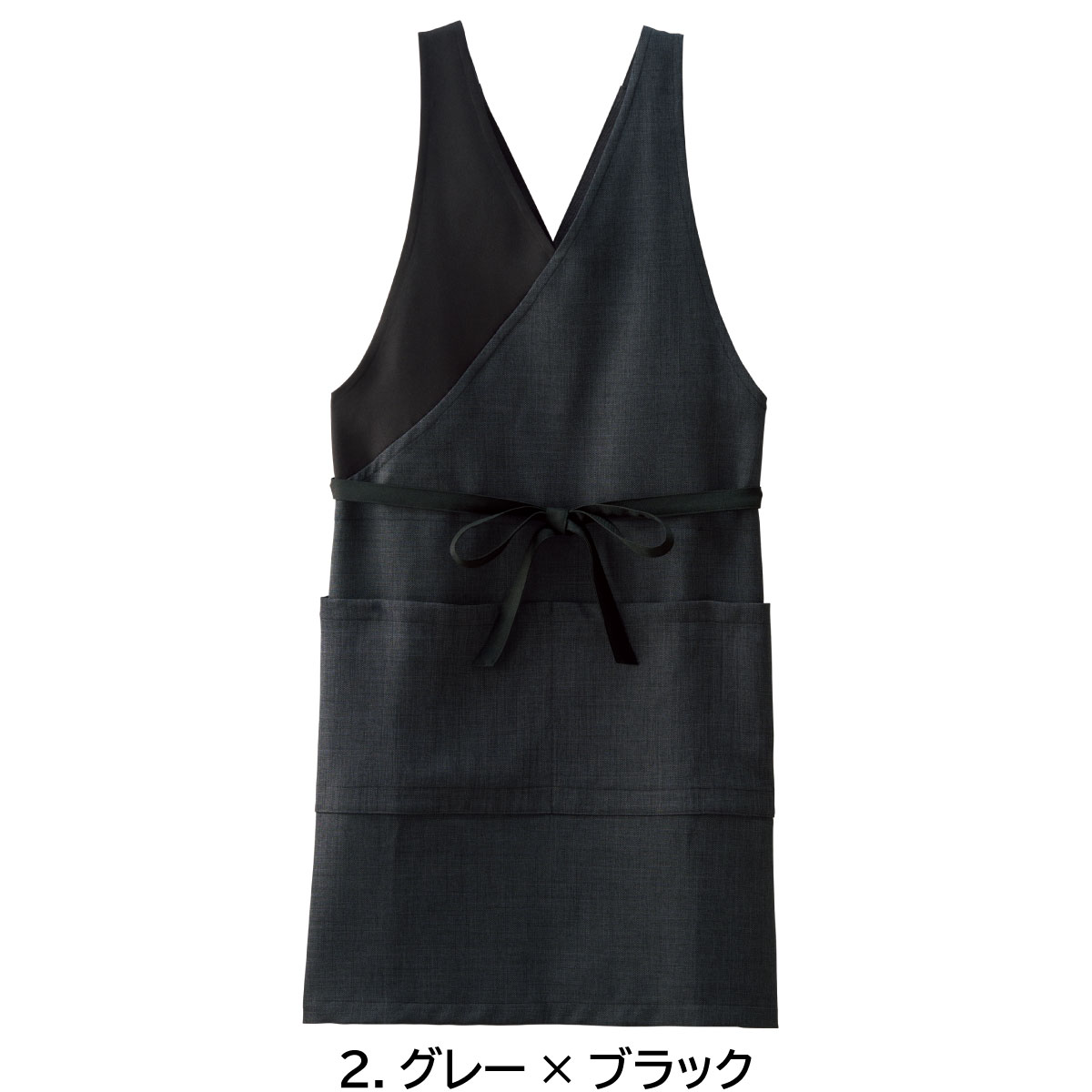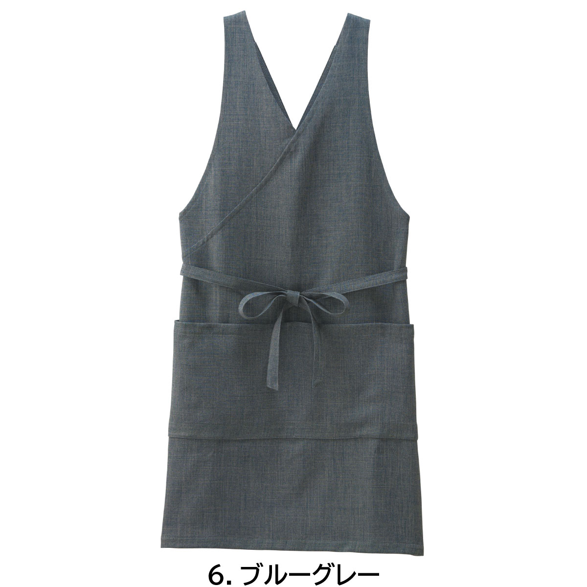 落ち着いた色合いの 和風胸当てエプロン 【MATERIAL】 素材:シャンブレー 混率:ポリエステル100% ■紐のクロス部分には ズレ防止のループ付き ■フロントには大容量で便利な 二分割ポケット付き ■身頃のボタンと紐のボタンホールで 肩紐の長さを調整可能 ■脇挟み込みポケット付き ■脇見返しボタン2個付き 【COLOR】 ■2.グレー×ブラック ■6.ブルーグレー 【SIZE】 ■F(フリーサイズ) 前丈:73cm 身幅:86cm