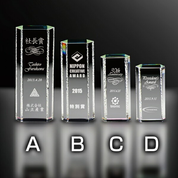 1. シンプルモダン&コンパクトなクリスタルトロフィー 2. インテリア性抜群!美しい倒角の正立方体デザイン 3. 思いのほか広くとれる加工可能スペース 4. デスクに置いても邪魔にならないサイズ感 5. 人や環境に有害な鉛を含まないエコクリスタル製 ※デザイン料・加工料【全て込みの価格】ですA:6cm×6cm×6cm 倒角 重さ約535g B:5cm×5cm×5cm 倒角 重さ約300g C:4cm×4cm×4cm 倒角 重さ約150gエコロジークリスタルガラス【最先端フルカラーUVプリント】 再現色20万色グラデーションも美しく発色します。 【サンドブラスト彫刻】 ガラス表面に彫刻を行います。 納期:デザイン確定後約1週間(納期相談で短期納期可能)