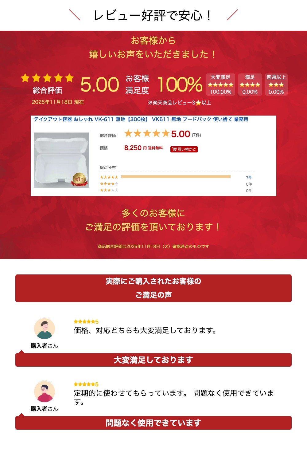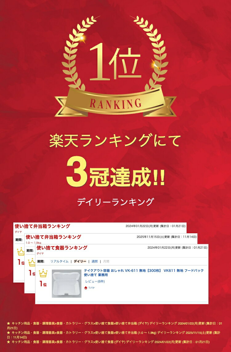VK-611 無地 300枚 メーカー名:シーピー化成株式会社 サイズ:外寸:212×156×46(フード高さ20)mm 材質:PSP 耐熱温度:85℃ ごはんの容量:約250g 蓋がワンタッチで閉まる発泡タイプの業務用使い捨てフードパックになります。 ランチボックスとしてご使用いただけます。 カフェ向け商品特集 サンプル無料送付の対応商品です。 希望の方は 店舗名、住所、電話番号の三点をお問合せからご連絡ください。 VK611 無地※個人宅配送不可商品です。送付先(宛名)に 店舗名 / 屋号 / 法人名 いずれかの記入をしてください。 ■個人様の場合は営業所止めにてお送りすることが可能です、福山通運の希望営業所を記入くださいませ。 ■沖縄県離島にお届けすることが出来ません。ご了承いただけますと幸いです。 ■カテゴリー容器、キッチン厨房用品のみ同梱可能になります。その他のカテゴリー商品をお選びいただくと表記上送料無料と表記されますが、それぞれ別途送料が必要になります。関連商品弁当容器 使い捨て Z-257 BS黒 透明蓋付【600枚】 Z257...弁当容器 使い捨て CTガチ弁 IK26-20A BK 身 【600枚...8,030円8,360円カチッとしまる嵌合フタ RP-5-1H 黒 高蓋 【600枚本体蓋セ...カチッとしまる嵌合フタ RP-3-1H 黒 高蓋 【600枚本体蓋セッ...8,580円7,920円テイクアウト容器 おしゃれ VK-612-2 キャメル【200枚】 V...テイクアウト容器 おしゃれ VK-613-3 キャメル【200枚】 V...6,050円7,590円テイクアウト容器 おしゃれ VK-610 無地【400枚】 VK610...弁当容器 使い捨て Z-253 BS黒 透明蓋付【800枚】 Z253...8,910円7,480円弁当容器 使い捨て Z-253-1 BS黒 透明蓋付【800枚】 Z2...使い捨てお弁当 VK-35 【400枚本体蓋セット】 VK35 テイク...7,480円7,370円