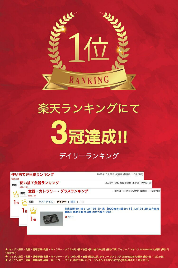 弁当容器 使い捨て LA-191-3H 黒 【900枚本体蓋セット】 LA191 3H お弁当箱 業務用 福助工業 弁当屋 お持ち帰り 宅配 レンジ対応