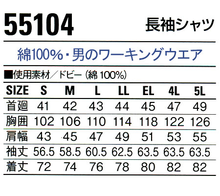 作業服 作業着 ワークユニフォーム 春夏用 Jawin 作業服 長袖シャツ かっこいい・おしゃれ 自重堂 ジャウィン Jichodo Jawin 55104 綿100% メンズ