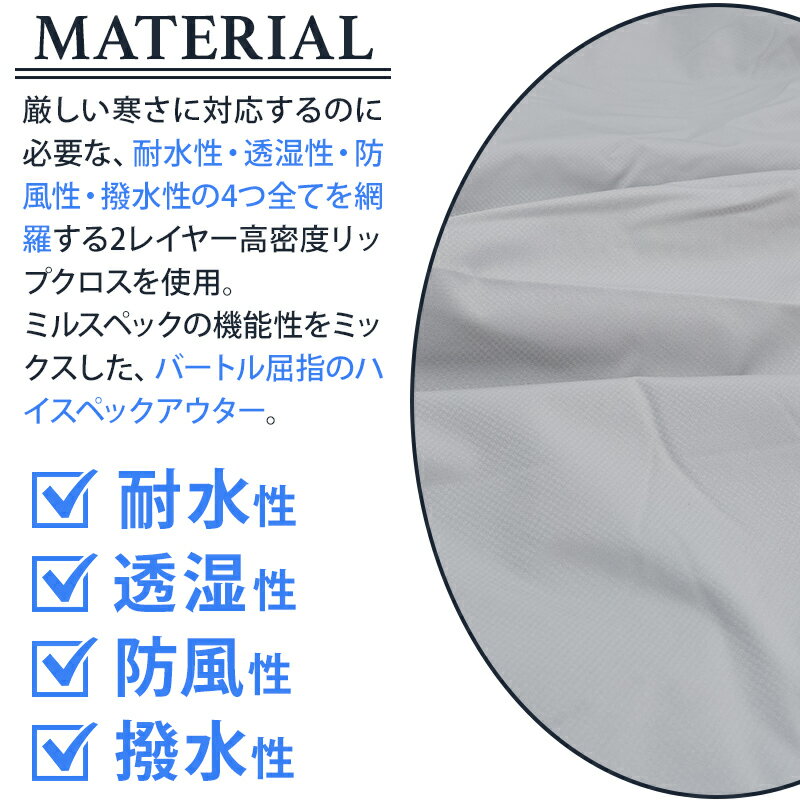 優れた防水透湿性を備える確かな防水防寒力はそのままに軽量化をプラスし、インナーに保温性の高い「サーモトロン ラジポカ」を装着したスポーティなルックスとミルスペックの機能性をミックスしたバートル屈指のハイスペックアウター 耐水性、透湿性、防風性、撥水性すべてを網羅する2レイヤー高密度リップクロスを使用 耐水圧15,000mm、透湿性15,000g/m2/24hrsを備えるハイスペックな機能素材 縫い目からの水の侵入を防ぐ防水シームテープ加工、袖にライムリフレクター(反射材)を配備し夜間の視認性をUP 品 番 BURTLE 7620 シーズン 秋冬用 素 材 マイクロリップシェル 裏地:全天候型保温素材「サーモトロン ラジポカ」、帯電防止「メガーナ」 混率:ポリエステル100% カラー 3 ネイビー 14 ミルスグリーン 35 ブラック 91 スノー 99 オーシャンブルー その他 S〜Mサイズはユニセックス対応シルエットになります。 制電ケア 耐久撥水加工 耐水圧:15,000mm 透湿性:15,000g/m2/24hrs 機能詳細一覧はこちら 作業服の色合いを揃えたい場合、同シリーズでお選び下さい。同メーカーでも品番が異なると素材の特徴により色合いが異なります。 防水防寒ジャケット 防水防寒パンツ ▼この商品の実力を動画で紹介しています▼