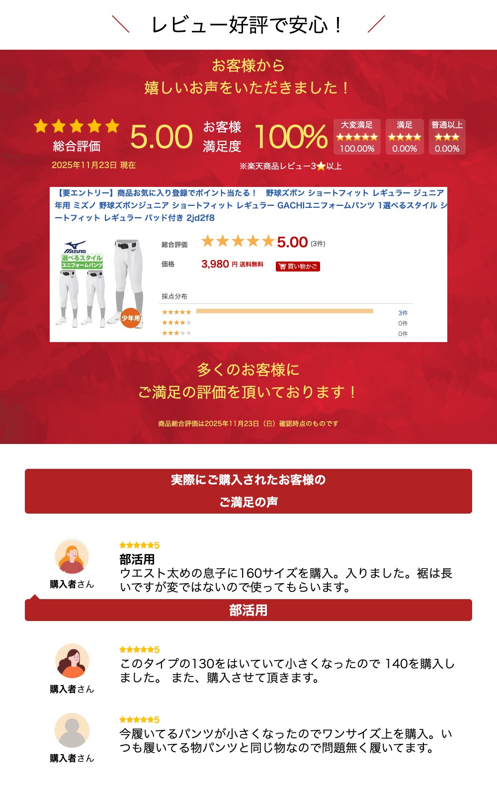 強い伸びるは当たり前、防汚と抗菌防臭機能をプラス。練習にも試合にも大活躍のジュニア用ユニフォームパンツ「ガチシリーズ」■スタイル/・レギュラー(ヒザ2重)/12JD2F8001・レギュラー(パット付き)/12JD2F8301・ショートフィット/12JD2F8401■カラー/ホワイト(01)■サイズ/120(001のみ)、130、140、150、160(001実寸)股下:120(38cm)、130(42cm)、140(46cm)、150(51cm)、160(55cm)(301実寸)股下:130(42cm)、140(46cm)、150(51cm)、160(55cm)(401実寸)/股下:130(36cm)、140(39cm)、150(43cm)、160(46cm)JISサイズ/モデル:身長158cm 着用サイズ:150■素材/本体:ポリエステル100% 尻当て:ポリエステル100%■仕様/左前にランバードマークワッペン付ベルトは付いておりません。オリジナルマーベルト使用■機能性/こすり洗いなしでも泥汚れが落ちやすい優れた防汚性&臭いの元となる菌の増殖を抑える、防汚・抗菌防臭機能■生産国/インドネシア製ユニフォーム こども用 ジュニア 少年 パンツ 練習用 試合用 練習着 ミズノ Mizuno 野球 野球用品 野球ウェア 野球グッズ 人気 ブランド ☆2024unipan★関連商品野球ズボン ショートフィット ジュニア レギュラー ジュニア デサント...野球 スライディングパンツ ミズノプロ 大人 ファウルカップ収納式 パ...野球ズボン ショートフィット ジュニア レギュラー ジュニア デサント...3,999円3,479円3,699円ローリングス野球ズボン ジュニア 4d ショートフィット レギュラー ...ミズノ ネームプリント付き ジュニア用野球用練習着 ユニフォームシャツ...ローリングス メンズスライディングパンツ al12s01...4,189円4,340円4,004円ローリングス スライディングパンツ ウイメンズ専用 スライディングスパ...ミズノ ウェア KUGEKIスライディングパンツ・ジュニア 12jbc...野球 スライディングパンツ 大人 子供 ミズノ クーゲキ スラパン【配...4,004円3,652円2,999円ミズノ ジュニア 野球用 練習着 ガチシリーズ ユニフォーム 上下セッ...ミズノ ネームプリント付きジュニア用野球用練習着 ユニフォームシャツ ...ミズノ 野球用ジュニア練習着 練習用シャツ オープンタイプ 12jc8...6,980円3,999円2,999円【必ずご確認ください】最強配送についてのご注意【こちらをクリック】