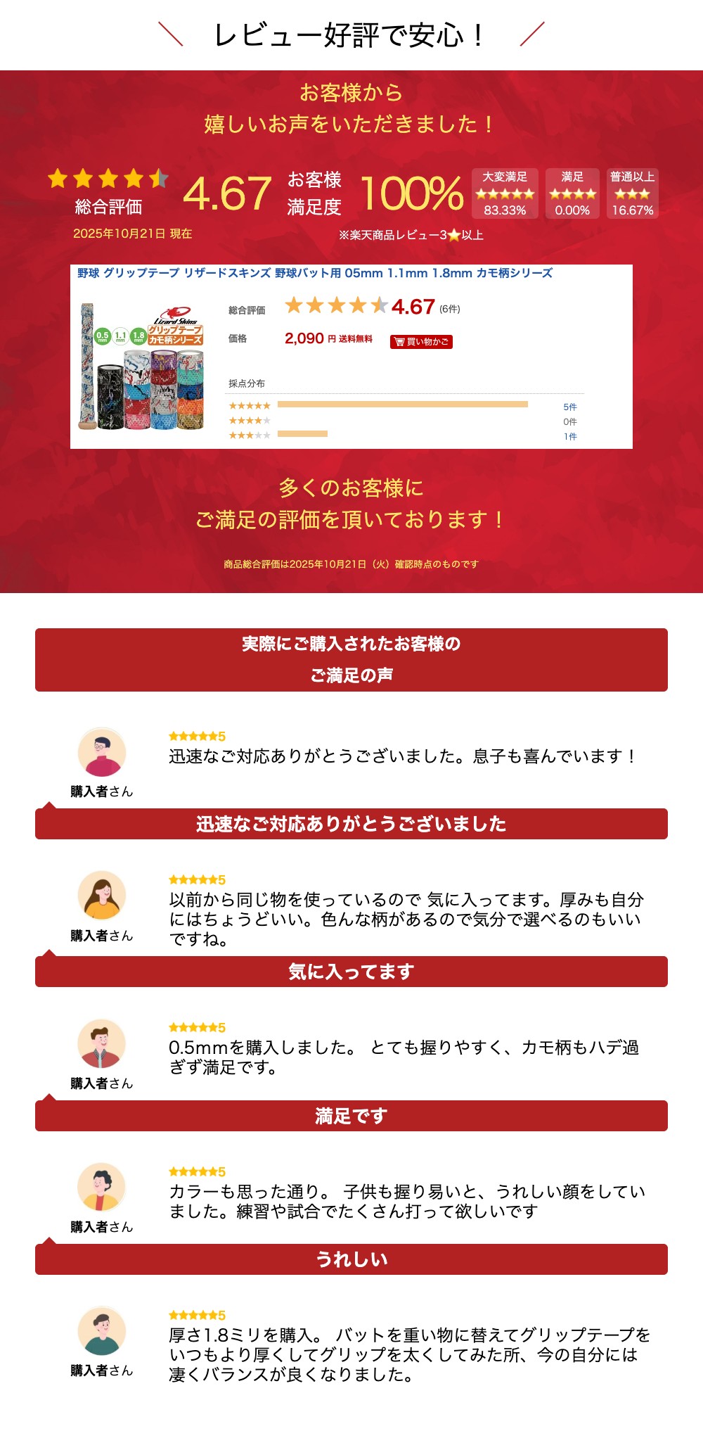Lizard Skins独自のDSP(デュラソフトポリマー)素材を使用。DSP素材は、非常に高いグリップ力と耐久性があり、バットのグリップテープに最適な素材。また、高い吸水性を持ち、汗をかいても滑りにくい素材。厚さは、木製バットにも使用できる「5mm」厚と金属バット用の「1.1mm」・「1.8mm」の3タイプ。人気の高いカモ柄デザイン、全19色展開。【カラーバリエーション】08:GEAUX CAMO11:CARBON CAMO12:SHOCK CAMO14:KONA CAMO17:GOBLIN CAMO24:ANTARTIC CAMO25:FURY CAMO31:SHADOW CAMO32:UNITED CAMO35:BLITZ CAMO42:GLACIER CAMO45:VICE CAMO46:CORAL CAMO48:MARVELOUS CAMO51:RED CAMO52:SCARLET CAMO53:PINK CAMO92:CRUSH CAMO99:VEGAS CAMO■素材/DSP(デュラソフトポリマー)■サイズ(厚み)/・0.5mm・1.1mm・1.8mm野球 ソフトボール バット グリップテープ リザードスキンズ MLB メジャーリーガー メジャーリーグ 木製バット 金属バット関連商品野球 グリップテープ リザードスキンズ 野球バット用 05mm 1.1...野球 グリップテープ リザードスキンズ 野球バット用 05mm 1.1...野球 グリップテープ リザードスキンズ 野球バット用 05mm 1.1...2,090円2,090円2,090円野球 グリップテープ リザードスキンズ 野球バット用 05mm 1.1...野球 グリップテープ リザードスキンズ 野球バット用 05mm 1.1...野球 バットクリーナー 汚れ落とし ミズノ メンテナンス用品 1gjy...2,310円2,310円1,999円野球 グリップテープ リザードスキンズ 野球バット用 05mm 1.1...野球 グリップテープ リザードスキンズ 野球バット用 05mm 1.1...滑り止め ローション クリーム マクダビット ストロンググリップ サラ...2,310円2,310円1,999円SSK エスエスケイ グリップテープ イオミック 1.1mm...野球 グリップテープ リザードスキンズ 野球バット用 05mm 1.1...レワード 半袖スターティングコート gw28...2,420円2,090円4,620円【必ずご確認ください】最強配送についてのご注意【こちらをクリック】