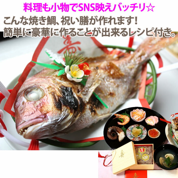 『お食い初め (百日祝い) 手作り料理セット』【送料無料】簡単レシピ付き!(天然鯛 赤飯 はまぐり (中国 or 国産) 数の子 ボイル済みタコ足 えび かまぼこ (梅 or えび) いくら or 歯固め石 鯛かご 祝い箸 敷紙 尾のし 寿飾り 赤飯の箱 折箱)