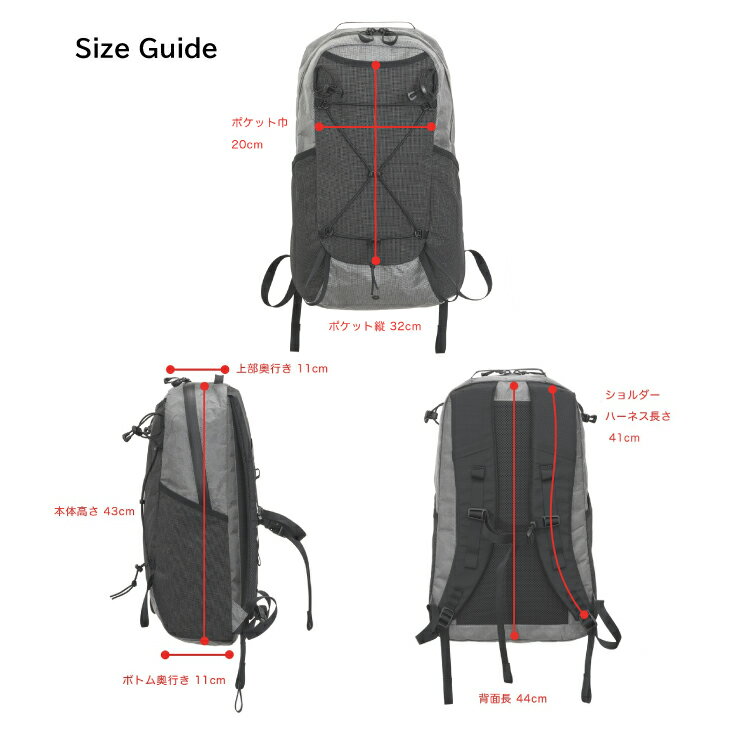 気軽に持ち運べるデイパック『One Mile』がシンプルさを追求しながら、新たな挑戦として生まれ変わりました これまでの容量やデザインの基本は維持しつつ、使用する素材やディテールを再検討し、よりシンプルな仕上がりを目指しました。 本体生地を耐久性と軽量性を兼ね備えたUltraWeave™ Ultra100X素材に変更しました。 ポケットデザインを再構築することで、全体のバランスを一層スッキリと整え、ミニマルなシルエットへと進化しました。 必要なものをコンパクトに持ち運びながら、気軽に使える心地よさ。「Trim」という言葉には、「削ぎ落とす」「整える」「洗練させる」といった意味が含まれています。 -------------------------------- 【特徴】 ・撥水性に優れた特殊加工が施されたYKKのAquaGuard® NATULON® コイルファスナーを採用 ・パック表面のフロントポケットには伸縮性と耐久性にすぐれた「UltraStretch™」を使用 ・TPU(熱可塑性ポリウレタン)製のリング状プラーを採用 ・本体上部にはハンドキャリーテープ ・ショルダーストラップの表生地は引き裂き強度と耐摩耗性に優れた420D ROBIC®リップストップナイロン。表面にはDWR(耐久撥水加工) ・ショルダーストラップの裏面と背面部分は通気性に優れたダブルラッセルメッシュ ・フロントポケット部分には、3mmΦの丈夫なバンジーコードを装備 ・下部にピッケルをしっかりと装着するためのピッケルホルダーテープ ・ワンタッチで簡単に取り外せるウエストベルト ・内部には、小物を収納するのに便利な小さなポケットとノートパソコンやハイドレーションシステムを収納できるポケット ・背面には、背負い心地を向上させる7mm厚のEVAフォームパッドが内蔵 -------------------------------- 【本体部分】(UltraWeave™ Ultra100X) 表面 超高分子量ポリエチレン 52%、ポリエステル 48% 中糸 超高分子量ポリエチレン 100% 裏面 ポリエステルフィルム 100% ファスナー YKKのAquaGuard® NATULON® コイルファスナー 5号 フロント、サイドポケット ナイロン66 68%、超高分子量ポリエチレン 21%、ライクラ®ファイバー 11%(UltraStretch™) 内ポケット部分 ナイロン 100%(210D ROBIC® Ripstop Nylon) 【ショルダーハーネス部分】 表面 ナイロン 100% (420D ROBIC® Ripstop Nylon) 芯材 10mm厚EVAフォーム 裏面 ポリエステル 100% (ダブルラッセルメッシュ) -------------------------------- 【製品スペック】 カラー Glacier GreyCharcoal GreyBlack Magic サイズ 高さ 約43cm × 上部奥行き 約11cm × 底の奥行き 約14cm 容量 約16 L 重量 約464 g 生産国 日本 生産者 兵庫県豊岡市 株式会社木和田正昭商店 -------------------------------- 【ご購入前の注意事項】 ※商品のスペック・パッケージ・デザインは予告なく変更される場合がございます。 ※掲載画像はイメージ画像です。お使いのモニター設定、お部屋の照明等により実際の商品と色味が異なる場合がございます。