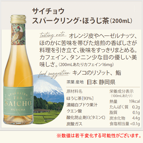 24時間低温抽出など食品化学の博士号を最大限生かした製造方法と原材料へのこだわりが、 スパークリングティーにシャンパーニュのようなきめ細かい泡と芳香を与えています。 高級感溢れるエキゾチックなボトルデザイン ボトルネックに大胆にあしらわれているのは、それぞれの茶葉の原産国を象徴する鳥(ほうじ茶 : キジ)。 茶飲料としてのクオリティに加えてボトルのデザイン性も高く、 イギリスの他、香港やシンガポールの一流ホテルでオンリストされています。 【サイチョウ・スパークリング・ほうじ茶】 厳選した静岡県産茶葉のセカンドフラッシュ(夏摘み)。 静岡県産の煎茶と茎茶(棒茶)を焙煎したほうじ茶を24時間低温抽出(93%)し、スペイン産白ブドウ100%果汁をブレンド。 濾過後に炭酸ガスを注入。抽出には、イギリス郊外の地下60mの源泉から汲み上げた天然水を使用。保存料無添加。 オレンジの皮、ロースト・ヘーゼルナッツやマッシュルームが漂う焙煎香。 ほうじ茶ならではの深みある香ばしい風味で、ほのかにビターなさっぱりした後味。 カフェインやタンニンも少な目で、からだに優しいノンアルコール・スパークリング・ティー。 ■ 輸入元 : ヴィレッジ・セラーズ株式会社 ■ 原材料 : 静岡県産ほうじ茶、濃縮白ブドウ果汁、クエン酸、酸化防止剤(ビタミンC)、炭酸ガス ■ 原産国 : イギリス ■ 飲み頃温度 : 約5℃ ■ セット内容: 正規品 SAICHO スパークリングティー ほうじ茶 200ml×24本 ■ アルコール度数 : 0度 (ノンアルコール) * オプションサービス お酒は食文化。慶祝贈答や催事。生活の様々なシーンで。 ●ご贈答用、ギフト、プレゼントに。リカーショップたかはし.では贈り物の様式、習慣に合わせて体裁よく熨斗の選定、包装、ラッピングのご要望にお答えさせていただいております。 【季節・年中行事】 お歳暮 お年賀 寒中御見舞 お中元 残暑御見舞 父の日 母の日 敬老の日 お誕生日お祝い 記念日 お正月 御歳暮 御中元 クリスマス バレンタインデー ホワイトデー 法事 粗供養 お供 【人生の門出・御祝事に】 上棟御祝 上棟記念 上棟内祝 お引越し御祝 地鎮祭 改築御祝 落成御祝 開店御祝 創業御祝 成人式 就職祝 退職祝 御誕生日御祝い 昇格昇進栄転の御祝 当選御祝 受賞御祝 優勝御祝 内祝 御年賀 【長寿の御祝に】 還暦 古希 喜寿 傘寿 米寿 卒寿 白寿 百賀 【お付き合い・心づかい】 粗品 粗酒 御見舞 快気内祝 寸志 景品 記念品 ゴルフコンペ 【弔事・仏事・神事・祭り】 御供 法要 奉献 満中陰志 偲び草 粗供養 献上 御神酒