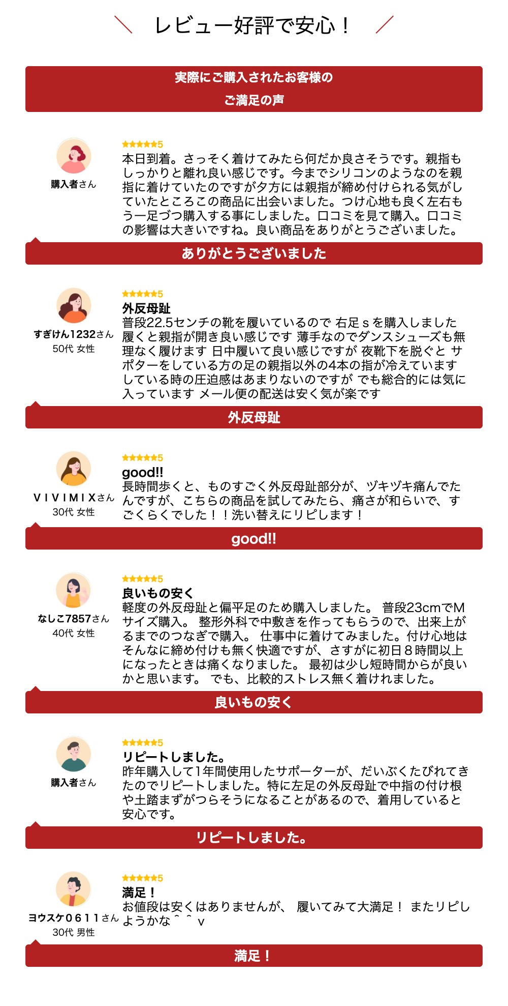 ■このような方に 外反母趾 開張足 超 薄型 外反母趾 サポーターによる 矯正 保護が必要。 足底アーチ タコ ウオノメ 魚の目 内反小趾 偏平足 縦アーチ 土踏まず 親指 変形 横アーチ つま先 の足の悩みのある方。 パンプス ハイヒール よく履く方。慢性的な足の悩み疲れやすい。 ■仕様について 男性用 女性用 兼用 目立ちにくいベージュ色 靴に合わせやすい薄型 ■ご利用上の注意 装着後痛を感じる場合はご利用を中止してください。 試着のみの場合はサイズ交換、返品に対応しております。 メールでにてお知らせください。 就寝時は外してください。 ※ご利用により変形が治る物ではありません。補助的な物としてご利用ください。 サイズ足の長さ甲回り S21.5cm ~ 23.0cm19.0cm ~ 22.0cm M23.0cm ~ 24.5cm21.0cm ~ 24.0cm L24.5cm ~ 26.0cm23.0cm ~ 26.0cm 足幅の特に広い方や母趾の曲がりが大きい方は大きめのサイズをお選びください。 メール便でのお届けについて お届けまで商品発送後4日〜1週間程度を要します。 お届け日時は指定できません。 代金引換はご利用できません。 メール便はポスト投函となりますので、受け取りの確認を致しません。あらかじめご了承下さい。 宅急便営業所留めでのお届けは承っておりません。 おじいいちゃん おばあちゃん 祖父 祖母 お父さん お母さん 父 母敬老の日 健康お祝い プレゼント関連商品腱鞘炎 腱鞘炎 サポーター 手首サポーター 手首 固定 骨折 後 の ...足底筋膜炎「歩けるんデス」(片足・両足)サポーター 偏平足 開張足 偏...バネ指 サポーター「うすサポ2」ばね指 サポーター 指サポーター 医療...1,980円1,980円1,870円腰痛 ベルト マタニティーベルト「イオンクールコルセット」 メッシュ ...足底筋膜炎 足裏サポーター 踵 骨 骨折 足底筋膜炎 靴下 足底筋膜炎...【肉離れ】「弾性Cベルト」Mサイズ(1枚)太もも サポーター パッド付...4,180円2,860円2,530円オスグッド サポーター 子供「オスグットケア」 オスグット病 成長期 ...「おやゆびロック」骨折 脱臼 リウマチ 腱鞘炎 手首サポーター 親指 ...【肉離れ】「弾性Cベルト」Lサイズ(1枚)太もも サポーター パッド付...3,025円3,278円2,750円ふくらはぎサポーター テーピング 機能付き ふくらはぎ 加圧サポーター...1枚100円・2枚300円OFF! 腱鞘炎 サポーター リウマチ 手首...腱鞘炎 腱鞘炎サポーター手首 腱鞘炎 指サポーター 腱鞘炎 手首 サポ...2,970円1,760円1,980円関連ワード: 外反母趾 サポーター 開張足 矯正 偏平足 たこ 魚の目 足底アーチ 内反小趾 つま先 パンプス ハイヒール 超薄型 ベージュ色 縦アーチ 横アーチ 土踏まず 足の悩み 矯正 グッズ 男性用 女性用 兼用 変形 保護 靴 薄型 取り扱い 敬老の日 お悩み プレゼント 外反母趾 サポータ 偏平足 サポーター 開張足 サポーター つちふまず 親指 変形 つま先 保護 開張足 サポーター 外反母趾 矯正 サポーター サポーター サポーター サポーター サポーター 矯正 グッズ サポーター 親指 開張足 横アーチ 矯正従来の外反母趾サポーターで失敗していませんか? サポーターは、歪んでしまった足を矯正し治すことが目的ではなく、足をサポートし疲労や痛みを和らげるために使用するものです。強く矯正するタイプのサポーターでは痛みを伴うことがあり、長時間履けずにサポーターの役割を果たせないこともあります。快美足は、超薄型設計で肌にやさしい二重構造にすることで長時間履くことを可能にしたサポーターです。 超薄型設計 足の科学から生まれた超薄型設計で足をやさしくサポートするため、長時間履いても快適で、靴を履いても気になりません。 肌にやさしい二重構造 サポーターと肌にやさしい生地の二重構造になっているため、長時間履いても快適な履き心地です。 履きやすく脱げにくい 靴下を履くように簡単に履くことができ、足全体をしっかりと包み込むため脱げにくくなっています。
