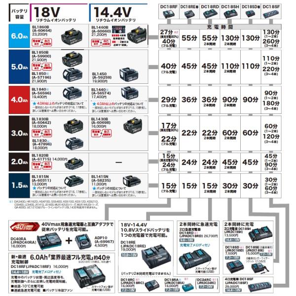 残量表示+自己故障診断ダブルで新搭載 質量が軽いリチウムイオンバッテリのセルを効率よくつなげ、本数を減らす事で、高容量ながら小型・軽量を実現しました。 継ぎ足し充電が可能! メモリ効果がないため、継ぎ足し充電が可能になりました。 長期保存に強い! 自己放電が少ないため、長期保存しても満充電に近い作業が可能です。 ※満充電状態で保存してください。対応バッテリー 電圧(V) 電流(Ah) セット名 セット内容 BL1860B(A-60464) 18V 6.0Ah バッテリー 充電器 充電時間 ケース BL1850B(A-59900) 18V 5.0Ah バッテリー・充電器・ケースセット パワーソースキット1 (A-61226) BL1860B×2本 急速2口充電器 DC18RD 55分(2本同時) マックパックタイプ3 (A-60523) BL1840(A-56596) 18V 4.0Ah BL1830B(A-60442) 18V 3.0Ah BL1820B(A-61715) 18V 2.0Ah BL1815N(A-60311) 18V 1.5Ah パワーソースキット2 (A-67094) BL1860B×4本 急速2口充電器 DC18RD 55分(2本同時) マックパックタイプ3 (A-60523) 充電器 対応バッテリー 充電時間 急速充電器 DC18RF 18V〜14.4V 40分 急速2口充電器 DC18RD 18V〜14.4V ADP04使用で7.2Vも可 55分(2本同時) 充電器 DC18SD 18V〜14.4V ADP04使用で7.2Vも可 130分 パワーソースキットSH1 (A-68317) BL1860B×2本 2口充電器 DC18SH 130分(2本同時) マックパックタイプ3 (A-60523) 2口充電器 DC18SH 18V〜14.4V 130分(2本同時) シガーソケット充電器 DC18SE 18V〜14.4V ADP04使用で7.2Vも可 130分 4口充電器 DC18SF 18V〜14.4V 130分(1〜3本) 260分(3〜4本)