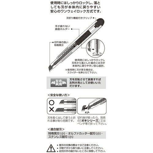 特長 上質感のあるオルファ・リミテッドシリーズの小型カッターです。 新方式オートロックは、使用時にはしっかりロックし、落としても刃がホルダ内に戻りやすい安心設計です。 左右両用のカッターです。 仕様・規格 刃厚:0.38mm 標準装着刃:BBタイプ 全長(mm):149 適合替刃:SSB5K・BB10K・BB50K・SB10K・SB50K 刃厚(mm):0.38 材質 本体:ABS樹脂 刃:合金工具鋼 質量・質量単位 30.2g