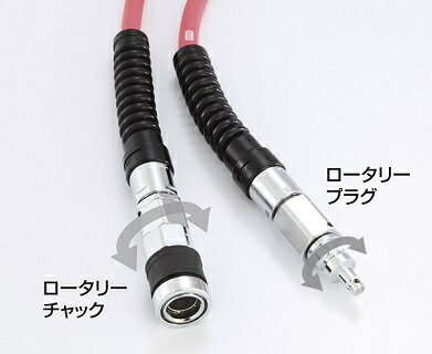 高品質!よれにくく使いやすい! やわらかさベストマッチング 現場環境に適した「やわらかさ」を持っています。 ホースねじれ軽減、両側ロータリー搭載 コンプレッサ側につなぐエアプラグと、釘打機側のエアチャックの両方が回転する事で、絡まったホースのよれが軽減されます。 取回し抜群 すべりやすい 帯電防止剤配合 ホコリが付きにくい帯電防止剤配合