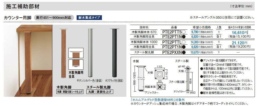 ●アジャスター高さ調節ができます。記載寸法+12mmまで調節可能です。 ●木製角脚は、現場カットで高さ調節可能です。短くする場合は上端をカットしてください。 ●壁付カウンターの補助専用です。自立テーブルの脚としては使用しないでください。 ●脚の取り付け間隔は1400mm以下、カウンターの端部からは、100mm以内に設置してください。 ●耐水・耐候性能はありません。