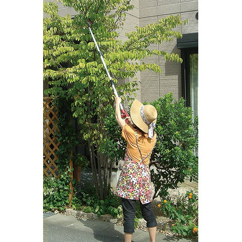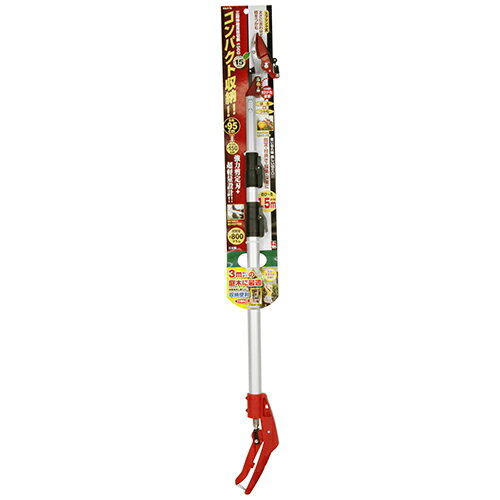 JANコード 4977292685849 ブランド名 千吉 商品名 三段伸縮高枝切鋏 1500 規格 SGLP-12 商品サイズ 幅1010 ×高さ100 ×奥行き40mm 重量840g 用途 庭木の剪定作業、果樹の収穫作業用。 機能・特徴 最短時の長さが95cmとコンパクトなので、傘立てや下駄箱に収納できます。 部品の付け外し不要のスプリング式キャッチ機能付きです。 従来品に加えてキャッチ力がアップしています。 全長も短いため、全体重量が800gと軽量です。 鋸刃(別売り)使えば、太枝の剪定もできます。 仕様 ●生木最大切断能力:約15mm(強力剪定タイプ刃)。 ●最大全長:1500mm(最短時:950mm)。 ●重量:800g。