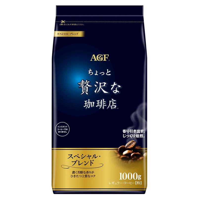 ※送料無料商品について※ ・【送料無料】商品であっても、単品ご購入額が3,980円(税込)未満の際は 1個口につき北海道宛1,080円・東北150円の送料が別途発生します。 ・沖縄県宛の発送の場合、単品ご購入額が9,800円(税込)未満の際は1個口につき 1,620円の送料が別途発送します。商品説明■ 商品説明"香り引き出す、じっくり焙煎"。「ちょっと贅沢な珈琲店」レギュラー・コーヒーは、厳選した豆の特徴に合わせて、AGF独自の「香り引き出す、じっくり焙煎」技術により、丁寧に焙煎した豊かなコクと深く濃い香り。珈琲店のマスターがハンドドリップで淹れたような贅を尽くした奥深い味わいと香りが楽しめるHRC粉です。「ちょっと贅沢な珈琲店」 レギュラー・コーヒー スペシャル・ブレンド1000gは、ブラジル産最上級グレード豆#2の特徴を活かした、濃く芳醇な香りがひきたつ上質なコクをお楽しみください。お得な大容量タイプ。コーヒードリッパーとペーパーフィルターを使用し、コーヒーサーバーや直接コーヒーカップに乗せて、コーヒーメジャーなどで容量を計ってドリップコーヒーをお楽しみください。もちろん、コーヒーメーカー、サイフォン、水出し用のアイスコーヒー 粉として水出しコーヒーポット・ボトル等、いずれの器具でもお楽しみいただけます。コーヒー豆の焙煎から充填まで国内の工場で生産し、繊細な日本の味覚に合わせて開発。誰にも邪魔をされず、ゆっくりしたい。1日の中で訪れる、ささやかでありながら、ちょっと贅沢な時間。そんな時間にふさわしいコーヒーです。※「粉」なので、コーヒーミルは不要です。■ 賞味期間(メーカー製造日より)13ヶ月■ 販売元味の素AGF株式会社