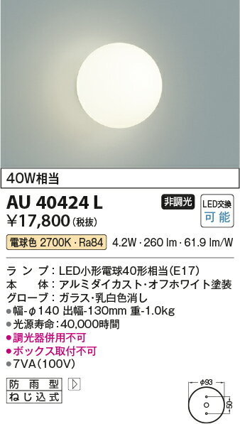 LED(電球色)白熱球40W相当ランプ:LED小形電球40形相当(E17)●アルミダイカスト・オフホワイト塗装●ガラス・乳白消し●幅-φ140 出幅-130mm 重-1.0kg●消費電力:4.2W●色温度:2700K●演色性:Ra84●定格光束:260 lm●光源寿命:40000時間●絶縁台不要●調光器との併用はできません防雨型検索用カテゴリ9【LED照明】 【電球色】 【非調光】 【防雨】