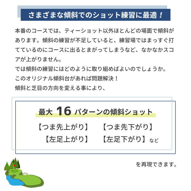 耐久性が高い人工芝マットと軽量の土台がセパレートタイプとなった傾斜台!・人工芝マットと土台はセパレート式となっているため、マットが傷んだ場合は交換が可能となっております。・20mm程度の芝となっているため、マットのどの部分でもボールが止まるように設計しております。・傾斜と芝目の方向を変える事により、最大16パターンの傾斜ショットを再現できます。【本体サイズ】1200×1200(八角形)14kg※製作材料の都合により下部土台の色に違いが出る場合があります。ご了承ください。なお、複数ご注文のお客様には同じ色での納品になります。