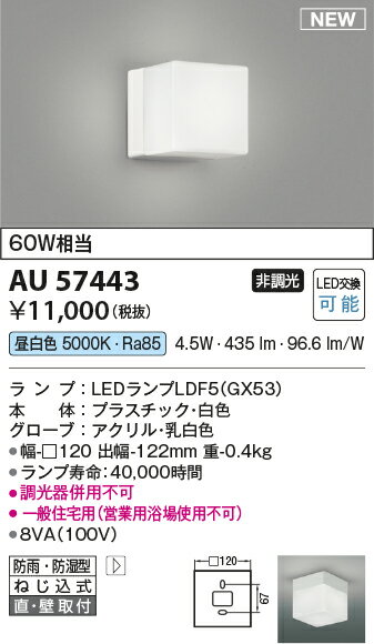 コイズミ AU57443 LED浴室灯 防雨・防湿型ブラケットライト 白熱球60W相当 昼白色 非調光 直付・壁付取付 照明器具 バスルーム用照明 天井照明
