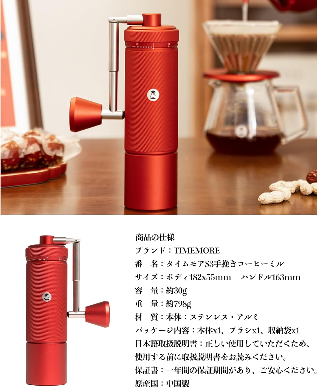 商品情報商品情報商品名:手挽きコーヒーミルブランド:TIMEMORE 型番:栗子S3材 質 :ステンレス・アルミ(全金属) 刃:S2C890ステンレス サイズ:ボディ182x55mm、ハンドル163mm 重 量 :約798g容 量 :約30g商品特徴【優れた刃】S2C890 (Spike to Cut/突き刺してから切る) という新規設計の臼刃です。五軸CNC高精度加工が施された、硬度55-58HRCの臼刃を採用。均一な挽目を実現し、同時に微粉の発生も最小限に抑えるので、雑味が少なくクリアな味わいをお楽しみいただけます。【調節機能】見やすい外部調節機能を備え、0.015mm/コマの超精細な調節が可能で、量化できるポイント式により精確な粒度の粗さを調整できるため、エスプレッソの高精度調節にも対応し、ハンドドリップやフレンチプレスなど、さまざまなコーヒースタイルを楽しめます。【デザイン】本体はオール金属ですので、耐久性が高いです。質感と高級感が溢れているコーヒーミルです。手の小さな方でも握りやすいコンパクトなボディ。ハンドルは折り畳みデザイン。軽量なので家庭用としてだけでなく、アウトドアや旅先へ携帯するのにも最適です。【優れた耐久性と省力性】ステンレス製の刃はセラミック製の刃より、素材としての硬度が高いため、耐久性に優れています。さらに、切れ味のよいステンレス刃、力の掛けやすいハンドル構造、滑り難い表面加工が施されたボディにより、優れた省力性(軽い挽き心地)も実現しました。商品保証ご購入から1年間メーカー保証付きます。安心にご使用いただけます。TIMEMORE タイムモア 栗子S3 手挽きコーヒーミル 手動式 S2C特許臼 手動グラインダー 全金属 30g コーヒーグラインダー 粒度調節 外部調節機能 4色選択可能 TIMEMORE タイムモア 栗子S3 手挽きコーヒーミル 手動グラインダー コーヒーグラインダー 5