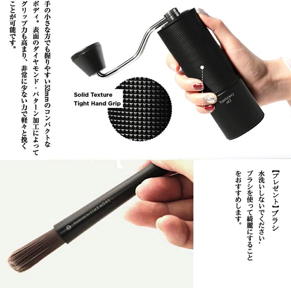商品情報商品情報商品名:手挽きコーヒーミルブランド:TIMEMORE 型番:栗子C3S材 質 :ステンレス・アルミ(全金属) 刃:ステンレス サイズ:ボディ147x52mm、ハンドル159mmボディ・ハンドル・スプリング:アルミニウム合金6063重 量 :約530g容 量 :約25g商品特徴【優れた刃】S2C (Spike to Cut:突き刺してから切る) という新規設計の臼刃です。均一な挽目を実現し、同時に微粉の発生も最小限に抑えるので、雑味が少なくクリアな味わいをお楽しみいただけます。【調節機能】約36階段で調整できます。調節ナットで細挽きから粗挽きまで簡単にお好みの粗さで挽いていただけます。ハンドドリップ 、フレンチプレス、エスプレッソなど様々なコーヒーを楽しめます。【デザイン】本体はオール金属ですので、耐久性が高いです。質感と高級感が溢れているコーヒーミルです。手の小さな方でも握りやすいコンパクトなボディです。軽量なので家庭用としてだけでなく、アウトドアや旅先へ携帯するのにも最適です。【優れた耐久性と省力性】 ステンレス製の刃はセラミック製の刃より、素材としての硬度が高いため、耐久性に優れています。さらに、切れ味のよいステンレス刃、力の掛けやすいハンドル構造、滑り難い表面加工が施されたボディにより、優れた省力性(軽い挽き心地)も実現しました。商品保証ご購入から1年間メーカー保証付きます。安心にご使用いただけます。タイムモア TIMEMORE 栗子C3S 手挽きコーヒーミル 手動式 コーヒーグラインダー ステンレス臼 粗さ調整可能 清掃しやすい coffee grinder 家庭用 省力性 ダイヤモンド タイムモア TIMEMORE 栗子C3S 手挽きコーヒーミル 手動式 コーヒーグラインダー 5