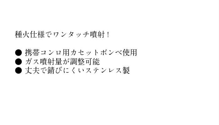 商品情報素材の注意書きお使いのモニターの発色具合によって、実際のものと色が異なる場合がございます。納期情報につきまして最短納期が表示されていますが、あくまで目安です。天候や運送会社の荷物の状況次第では、納期が前後することがございます。ご了承ください。タッチファイヤー プロフェッショナルカセットボンベ ガス 調節 丈夫 さび DIY 防水 種火仕様でワンタッチ噴射 ! 2