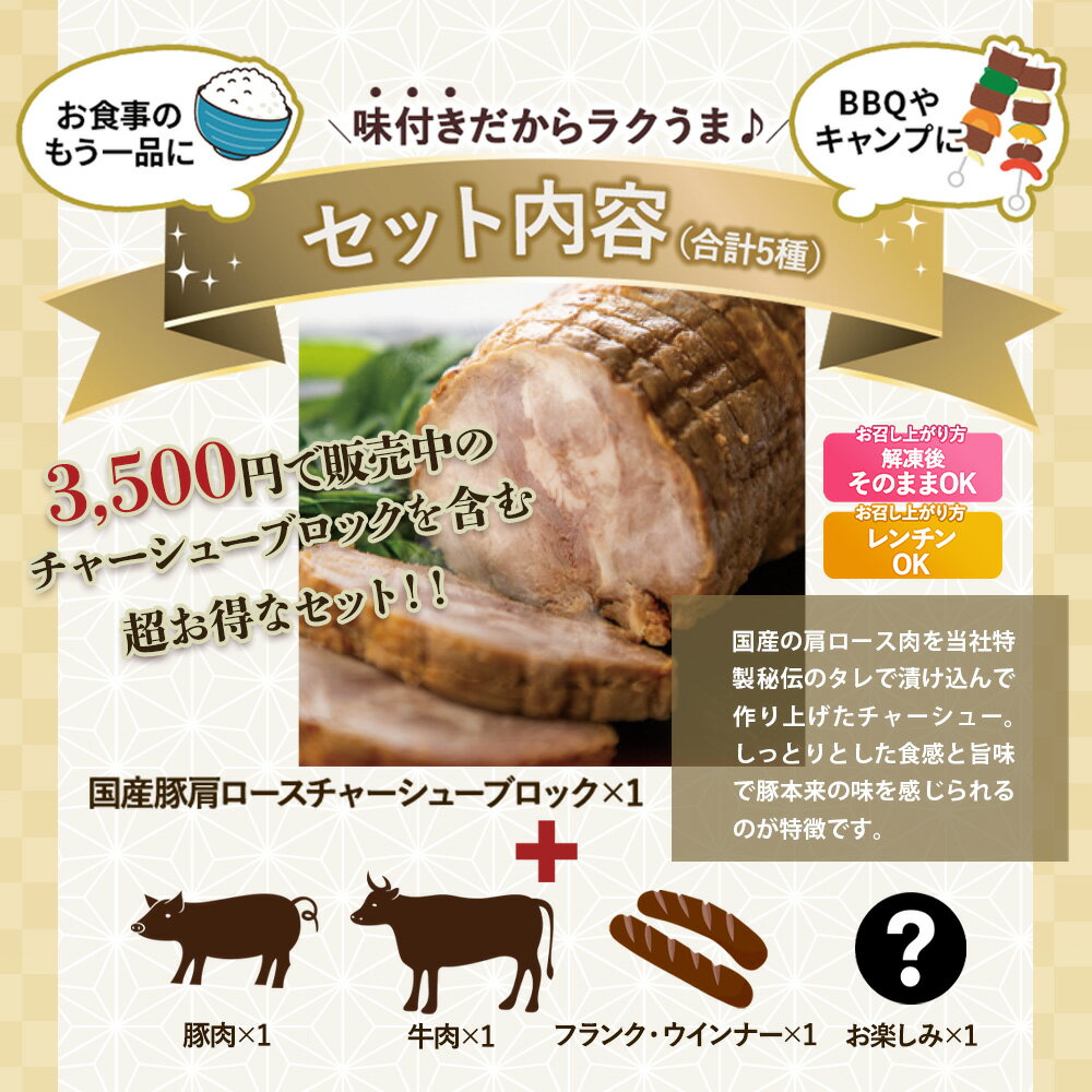 肉ガチャ! 肉 セット 5種【 肉屋の気まぐれセット 】 (1番人気!3,500円で販売中のチャーシューブロック含む) 武田ハム 食品 大容量 牛肉 豚肉 チャーシュー 焼豚 詰め合わせ ギフト おつまみ クリスマス