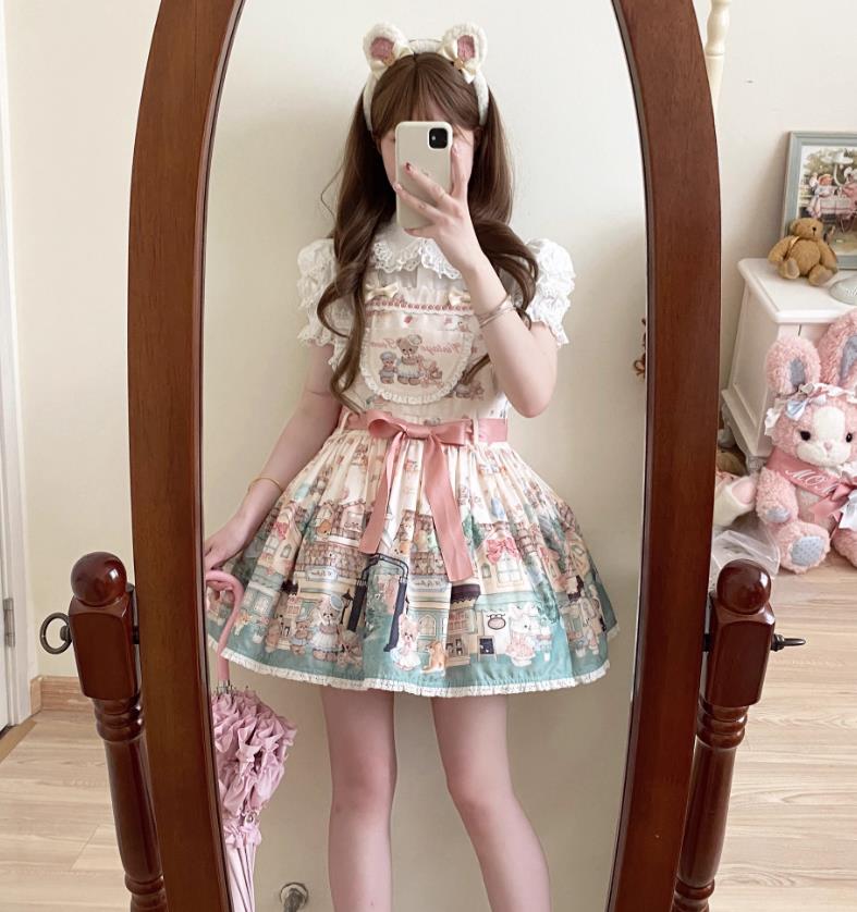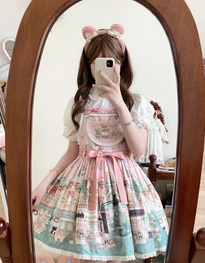 キャミソールスカートベアロリータスカートゴスロリワンピース ロリィタ OP Lolita ロリータ コスプレ 日常服ゴスロリワンピース人形師 レディースフリルレース ワインカート少女ワンピ jsk opロリータスカートストラップスカートピンクベージュ