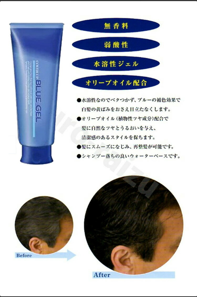 クラシエ カバーアップ ブルージェル160g■ 商品説明グレーヘアを自然に 目立たなくするジェル状整髪料 水溶性でベタつかず、ブルーの補色効果で白髪の黄ばみをおさえ目立たなくする整髪料。オリーブオイル(植物性ツヤ成分)配合で髪に自然なツヤとうるおいを与え、清潔感のあるスタイルを保ちます。 ●無香料、弱酸性 ●髪にスムーズになじみ、再整髪が可能 ●シャンプー落ちの良いウォーターベース■ 内容量160g■ 注意事項頭皮に異常が生じていないかよく注意してご使用ください。 頭皮に異常がある時、またはお肌に合わない時は、ご使用をおやめください。 体質に合わない場合は、利用を中止し医師に相談して下さい。 直射日光の当たる場所、極端に高温や低温になる場所には保管しないでください。 乳幼児の手の届かないところに保管してください。 効果・効能については、個人差がございます。■ ※【ご購入前に必ずお読み下さい】※受注のタイミングによりましては在庫切れとなり発送の遅延、 商品がメーカー廃盤の場合はご注文をキャンセルさせていただく事もございます。 出来る限り迅速にご対応できますよう最善を尽くさせていただきますので、 どうぞ宜しくお願い申し上げます。 【ご注意】パッケージやデザインがリニューアルされたり、 内容量等が新しく変更になる場合がございますので予めご了承のうえご注文くださいませ。[ヘアカラー][JAN: 4901417599377]商品説明 ●ベタつかない シャンプー落ちの良い水溶性なので、ベタつきません。 ●オリーブオイル配合 植物性ツヤ成分の働きで、自然なツヤと潤いを与えます。 ●無香料 ライトパープルの色調とほのかなシトラスフローラルの香り シャンプーですくに落とせる水溶性です。 ※受注のタイミングによっては在庫切れになる場合があります。 その場合御了承下さいます様お願いいたします。 ※予告なくパッケージ、仕様等が変更になる場合がございますがその際はご了承下さいます様宜しくお願い致します。