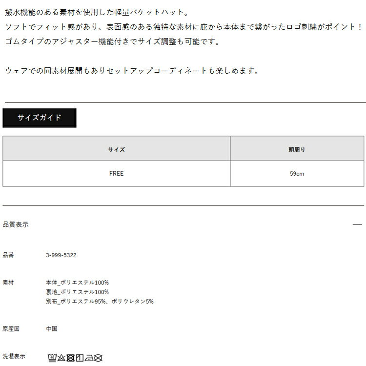 【Recommended】 小雨時はレインキャプとしても使える撥水機能のある素材を使用した軽量バケットハット。 ソフトでフィット感があり、表面感のある独特な素材に庇から本体まで繋がったロゴ刺繍がポイント! ゴムタイプのアジャスター機能付きでサイズ調整も可能です。 ウェアでの同素材展開もありセットアップコーディネートも楽しめます。 中国製 Made in CHINA 商品名 water repellent bucket hat/ UNISEX 商品番号 3-999-5322 サイズ FREE 頭周り:59cm 素材 ポリエステル100% 別布:ポリエステル95% ポリウレタン5% 対象 メンズ 男性用 レディース 女性用 男女兼用 ユニセックス 楽天スーパーロジスティックスから発送致します 最強翌日配送対応しています 種別 キーワード ショップ カテゴリー ゴルフショップ メンズゴルフウェア レディースゴルフウェア 取扱い 販売経路 日本正規品 正規取扱い店 商品種別 関連語 バケットハット ゴルフハット ゴルフアパレル 大人ゴルフファッション メンズウェア レディースウェア ブランド名 DECEMBERMAY(ディセンバーメイ) 特徴 撥水 軽量 ロゴ ビッグロゴ 無地 シンプル スタイル デザイン 格好いい おしゃれ かわいい 上品 高級 おとな 目的 用途 人気 おすすめ 定番 自分用 プレゼント ギフト 誕生日 贈り物 父の日 母の日 クリスマス 着用 使用 シーン ゴルフ場 ラウンド 練習場 アクティブ アウトドア スポーツ 普段使い シーズン 季節 春 夏 秋 冬 色(カラー) 灰色(グレー) サイズ フリーサイズ