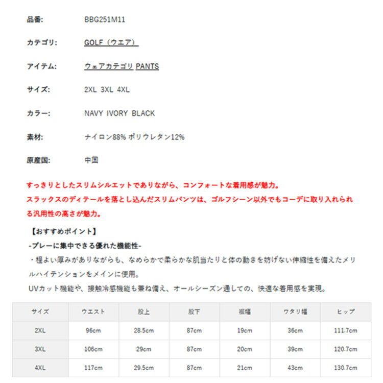 【商品情報】 すっきりとしたスリムシルエットでありながら、コンフォートな着用感が魅力。 スラックスのディテールを落とし込んだスリムパンツは、ゴルフシーン以外でもコーデに取り入れられる汎用性の高さが魅力。 -プレーに集中できる優れた機能性- ・程よい厚みがありながらも、なめらかで柔らかな肌当たりと体の動きを妨げない伸縮性を備えたメリルハイテンションをメインに使用。 ・UVカット機能や、接触冷感機能も兼ね備え、オールシーズン通しての、快適な着用感を実現。 -無駄をそぎ落としたクリーンなデザイン- ・ポケットやウエストはプレーンなスラックスのデザインを採用し、上品さを感じさせる佇まいに。 ・BマークロゴやベルトループなどBRIEFING GOLFおなじみのディティールでブランドらしさを表現。 【BASICS COLLECTION】 優れた機能性にスタイリッシュなデザイン性が融合したBRIEFING GOLFに必要不可欠な定番アイテムをお届けいたします。 商品名 KING MEN'S BASIC PANTS 商品番号 BBG251M11 対象 メンズ 男性用 ブリーフィングゴルフ一覧はこちら メーカー希望小売価格はメーカーカタログに基づいて掲載しています。 楽天スーパーロジスティックスから発送致します 最強翌日配送対応しています 種別 キーワード ショップ カテゴリー ゴルフショップ メンズゴルフウェア 取扱い 販売経路 日本正規品 正規取扱い店 商品種別 関連語 パンツ ゴルフパンツ ゴルフアパレル 大人ゴルフファッション メンズウェア ブランド名 Briefing GOLF(ブリーフィングゴルフ) 特徴 ボトムス 10分丈 無地 ロゴ ストレッチ ストレート シンプル UVカット 接触冷感 ベーシックスコレクション スタイル デザイン かっこいい おしゃれ 上品 高級 おとな 目的 用途 人気 おすすめ 定番 自分用 プレゼント ギフト 誕生日 贈り物 父の日 クリスマス 着用 使用 シーン ゴルフ場 ラウンド 練習場 スポーツ アクティブ 普段使い シーズン 季節 春 夏 秋 冬 色(カラー) 黒(ブラック) 紺(ネイビー) 象牙色(アイボリー) サイズ 2XL 3XL 4XL