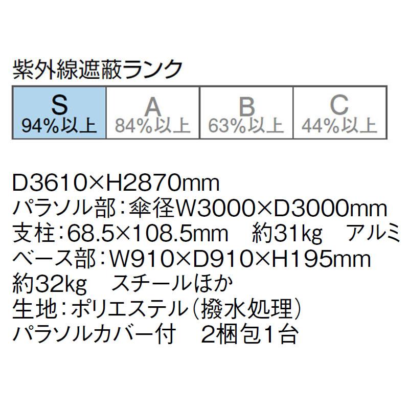メーカーから発送のため代金引換決済はできません。 北海道、沖縄、離島への送料はお見積りになります。 ■ACT-01WH 45698700 シェードメーカー パラソル シリウス ホワイト D3610×H2870mm パラソル部:傘径W3000×D3000mm 支柱:68.5×108.5mm 約31kg アルミ ベース部:W910×D910×H195mm 約32kg スチールほか 生地:ポリエステル(撥水処理) パラソルカバー付 2梱包1台 ●屋上などの高所や強風が予測される場所には、パラソルを 設置しないでください。 ●ご使用前にパラソルベースにしっかりと固定されていることを 確認してください。 ●パラソルは管理者のもとで使用してください。 離れるときは必ず閉じてください。 ●強風時や雨天時はパラソルを室内に収納してください。 予期しない突風の場合にも、すみやかに閉じる、収納するなどの 対処をしてください。 ●パラソルは日よけ専用です。防水性はありません。