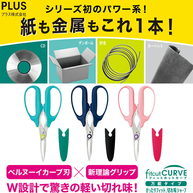 【PLUS/プラス】フィットカットカーブ 万能タイプ SC-175PMグリーン 34-630ネイビー 34-631ピンク 34-632 紙から金属までこれ1本!カーブ刃×新理論グリップのW設計で軽い切れ味!ワイドグリップで力を入れやすい!ベルヌーイカーブ刃で切れ味UP!CDやカードもラクラク。針金切付き。) ●全長:178mm ●刃渡り[mm]:48 ●個包装形態:ブリスターパック入 ●キャップ付 ●色:グリーン 34-630 / ネイビー 34-631 / ピンク 34-632 ●材質:グリップ=PE、刃・カシメピン=ステンレス鋼、がたつき防止リング=POM、キャップ=PP 本体サイズ:幅 87mm × 奥行き 14mm × 高さ178mm:重量 90g 個装サイズ:幅 106mm × 奥行き 15mm × 高さ214mm:重量 120g 商品コード:34630 / 34631 / 34632 JANコード:4977564647520 / 4977564647537 / 4977564647544 【切れるもの】 アルミ板:厚さ0.6mm以下 銅板:厚さ0.5mm以下 トタン板・ブリキ板:厚さ0.3mm以下 ステンレス板:厚さ0.2mm以下 ゴム板:厚さ7.0mm以下 革:厚さ2.0mm以下 プラスチック(軟質):厚さ2.0mm以下 プラスチック(硬質):厚さ1.2mm以下 アルミ針金:直径2.5mm以下 銅針金:直径1.6mm以下 針金(亜鉛メッキ鉄):直径1.2mm以下 ※ピアノ線・ゼムクリップ・ステンレス針金・極端に薄いもの(ビニールなど)は切れません。