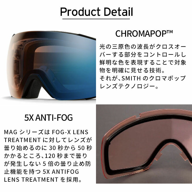 メーカー希望小売価格はメーカーカタログに基づいて掲載しています SMITH スミス スキー ゴーグル メンズ レディース■I/O MAG アイオー マグカラー:レンズ(可視光線透過率)■Back:CP Pro Photochromic Blue Mirror(16-55%)【調光】■Back:CP Storm Blue Sensor Mirror(55%)SMITH MAGTM レンズチェンジシステムを搭載したインターチェンジブルゴーグル。 独自のマグネットシステムとレンズセキュリティシステムを採用。 顔全体を包み込む完 璧なフィットを求めたミディアムサイズフレームを採用。 フォグフリービジョンを可能に するAir EvacTMM 機能でヘルメットとの究極なインテグレーション。最大限の視界を 確保するラージサイズの球面レンズには5XTM アンチフォグテクノロジーを装備。 一 切無駄のないコンパクトな構造がマグネットゴーグルとは思えない軽さを実現。 1枚で 全天候に対応できる史上最強のCP Pro Photochromic レンズをBlack に採用。 クロマポップレンズ2枚標準装備。 環境を考慮したサスティナブルパッケージにアップ デートされたため、gogglesocレンズプロテクターが付属する。付属品・GoggleSoc・レンズ交換が一瞬で可能なマグネットレンズ交換システムを搭載・レンズ2枚付属で全天候対応・5倍の曇り止めテクノロジーベルト幅 [43mm ]■特徴曇り止めレンズ 全天候型レンズ・オールラウンドレンズ 晴天用レンズ 曇り用レンズ スペアレンズ付き ダブルレンズ 球面レンズ ミラーレンズ★当店で取り扱っている商品は国内正規品となりますので、SMITHのスキーゴーグルは全て【ASIAN FIT】仕様となっております。※メーカー企画書の情報で商品登録を行っております。予告なしに商品名と仕様変更される場合がございます。