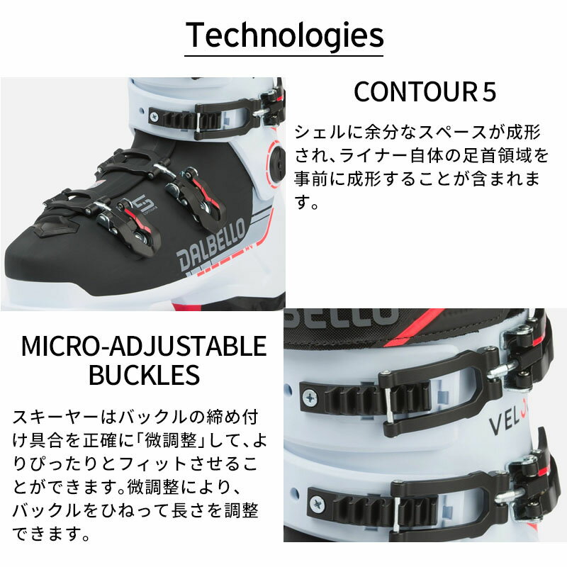 メーカー希望小売価格はメーカーカタログに基づいて掲載しています DALBELLO ダルベロ スキーブーツ■VELOCE 90 MV ヴェローチェ 90 エムブイフレックス(硬さ):90ラスト(26.5cm):100mmCOLOR・POLAR/BLACKSIZE・24.5・25.5・26.5・27.5・28.5・29.5・30.5ダイナミックなターン、スピード、スムーズなスキーコントロールを実現しダイレクトにパワー伝達し、そして履きやすく快適なフィット感など、VELOCE 90 GWは全てを兼ね備えています。デュアルインジェクションシェルは、エントリーを容易にするために上部がわずかに柔らかく、正確なスキーコントロールのために下部が硬くなっています。Hyperlightの袖口、追加のVelcroストラップ、最適なフレックスを備えたこのブーツは、スキーをより敏感で楽しいものにするために必要なサポートとパワー伝達を正確に提供します。イージークローズバックルは、足全体とふくらはぎ全体に均等に圧力を分散します。スポーツライナーは、本当に寒い日でも、優れたヒールサポートと十分な断熱性を提供します。ライナーとシェルは、MyFitテクノロジーにより、足に合わせて別々に調整できます。事前に装着されたGripWalkソールは、歩行を容易にし、滑りにくくします。 ※メーカー企画書の情報で商品登録を行っております。予告なしに商品名と仕様変更される場合がございます。0